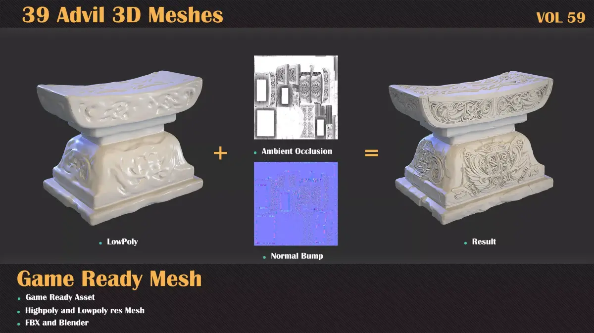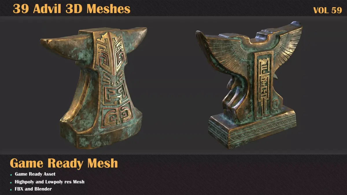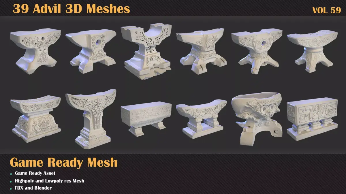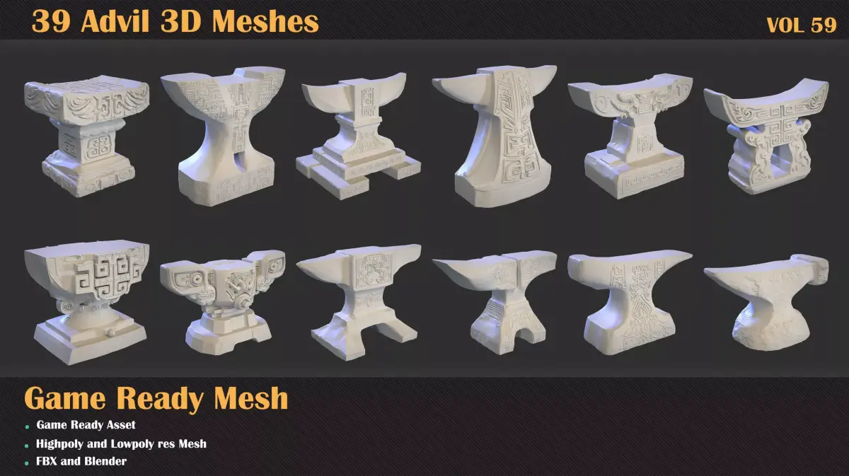 Anvil – Game Ready 3D ModelA detailed 3D anvil model with ornamental carvings, ready for use in games, cinematic scenes, and real-time environments.This model includes both highpoly and lowpoly versions, ready to drop directly into any game engine or rendering pipeline with no extra setup.What's Included: