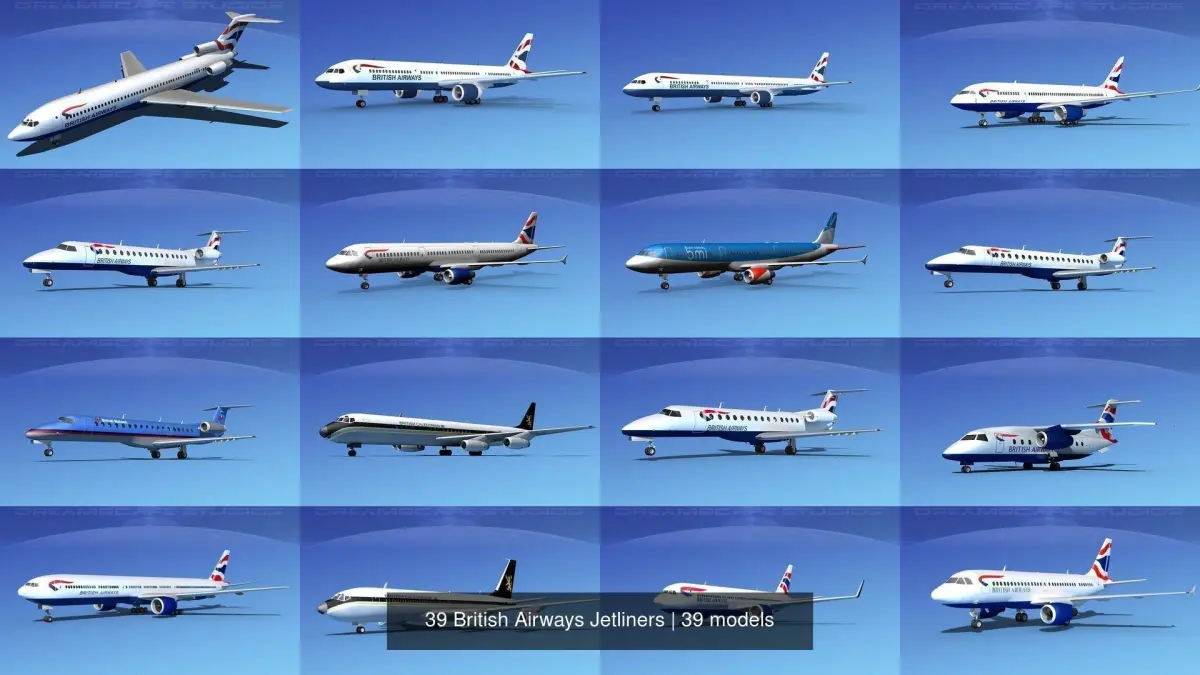 Boeing 777 includes animateable landing gear, landing gear doors, rudder, elevators, ailerons, flaps, engine turbines, also beacon and navigation lights. Boeing 767-100 and 767-200 include animateable control surfaces and retractable or hide able landing gear and animateable turbines. 767-300 has animateable control surfaces including ailerons, flaps, inboard flaps, elevators, stabilizers, rudder, landing gear doors, turbines and retractable landing gear. Boeing 757-200 and 757-300 include animateable landing gear, landing gear doors, rudder, elevators, ailerons, flaps, engine turbines, also beacon and navigation lights. Boeing 707, 747-100 747-400 have animateable flaps, ailerons, elevators, rudder, landing gear, landing gear doors and turbines. Boeing 787-8 includes animateable landing gear, landing gear doors, rudder, elevators, ailerons, flaps, engine turbines, also beacon and navigation lights. Airbus A340-600Airbus A319, A320, A321 include some exterior detail and has animateable features including ailerons, flaps, elevators, rudder, turbines, landing gear retraction and landing gear doors.Embraer ERJ-140 have retractable landing gear, animateable ailerons, flaps, elevators, rudder, and turbines.