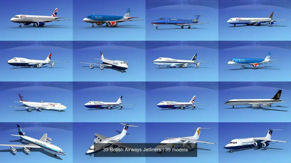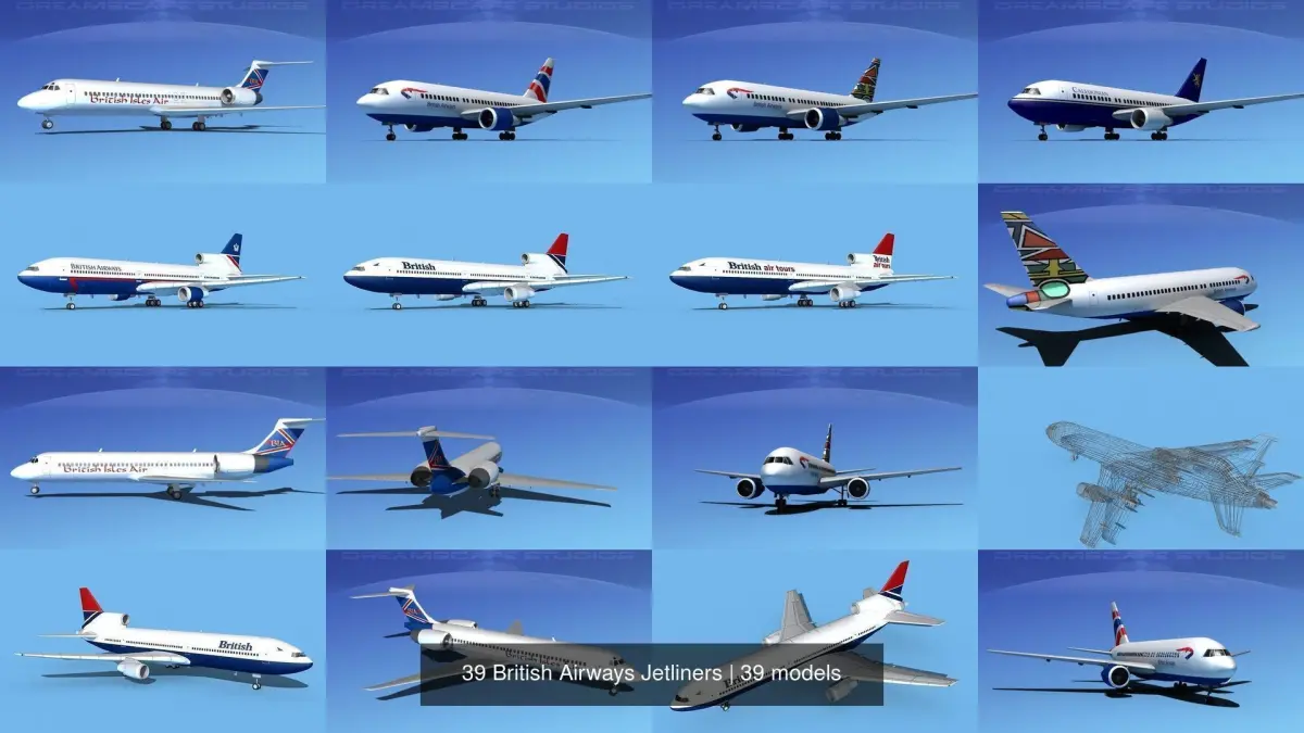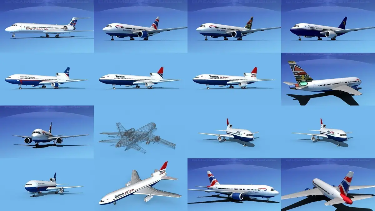 This selection of jetliners are created near to scale (within 5%) according to the real reference. Models are exported to a wide variety of formats. Other formats are exported in one resolution. This can be further subdivided. Exported formats (3ds, lwo and obj) are prepared well to work correctly with every standard modeling software. Compatibility level with other software’s may be limited. Textures are included with all files. These models were built with animation and videos in mind, also a good models to populate airport scenes as an active or static subject. These could also be programmed to use in some flight simulation programs. Previews were rendered using 3dsmax standard scanline. Lockheed L-1011 has animateable features including turbines, landing gear retraction and extension, landing gear doors, rudder, elevators, ailerons, inboard and outboard flaps and includes a lot of exterior detail.