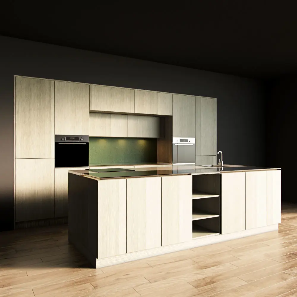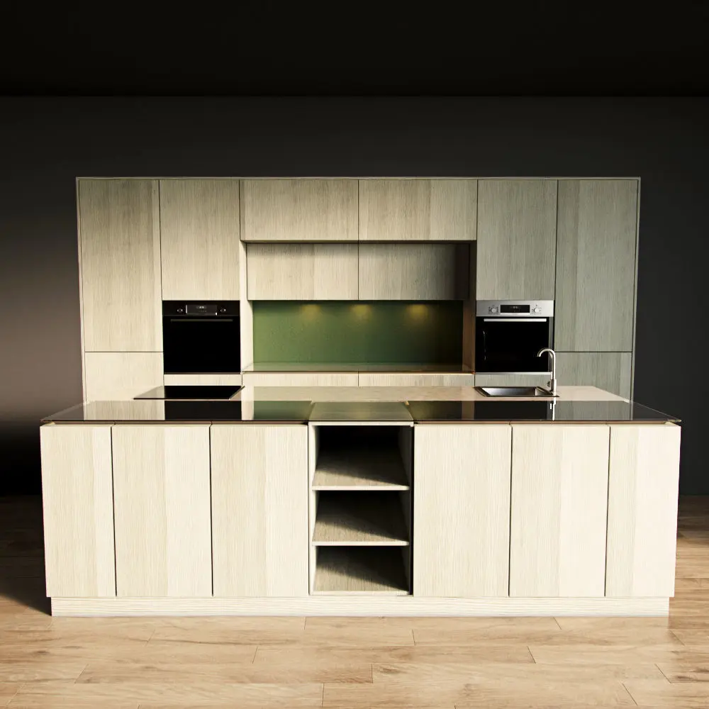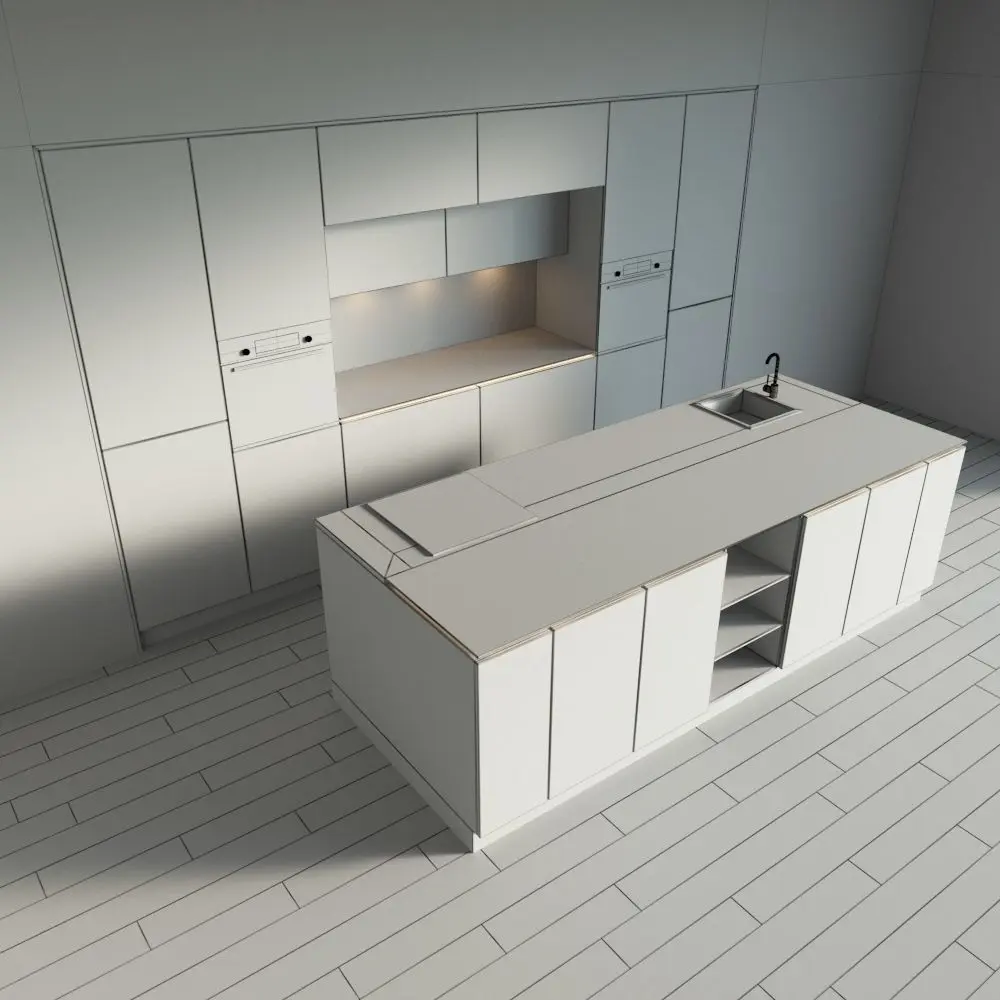 Only the kitchen and the island are present in the scene. The floor, walls, ceiling are yours.