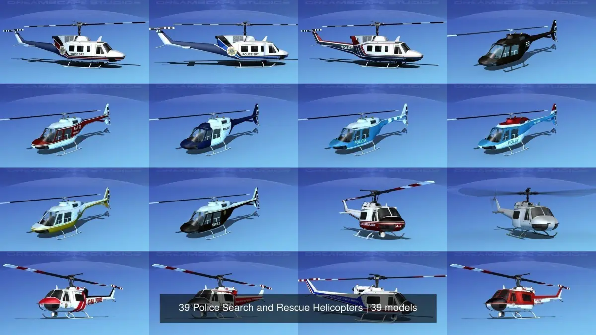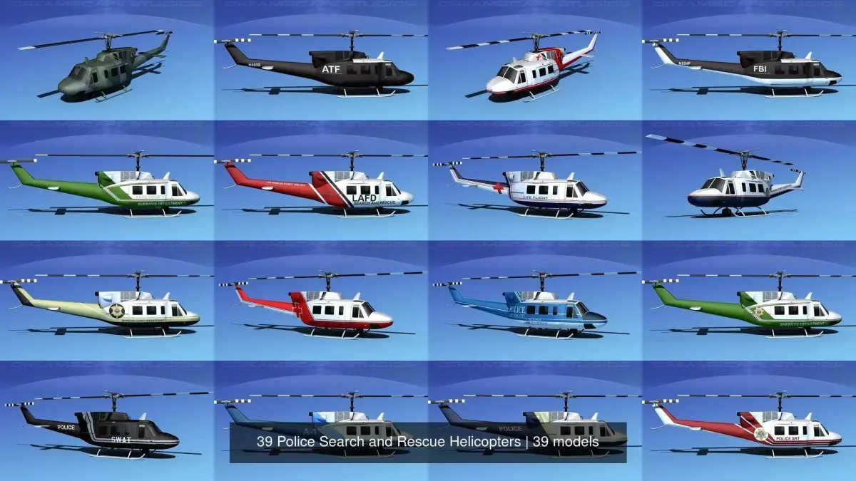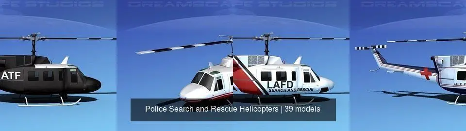 These 39 copters are originally built in Max 13 near to scale (within 3-4% of scale). Models are available in several formats for a wide variety of end users. Exported formats (3ds, lwo and obj) are prepared well to work correctly with every standard modeling software. Compatibility level with other software’s may be limited. Models are textured with multiple HD maps and provide a good realistic rendering when lighted and animated properly. Previews were rendered using 3dsmax standard scanline. Copters include many animateable features. The main rotor, tail rotor, doors, hoist and spotlight are animateable. Much detail is included. Some models include light weight passenger seating while others include empty cargo space. Cargo doors, auxiliary and flight crew doors can be opened or removed or animated. Some models have animated rotor and tail-rotor. The side loading doors and crew doors can be closed and opened to reveal some good detail in the cabin and cockpit on UH-1B Iroquois, also the pilot and copilots seat include the armor and controls and the instrument panel is viewable from outside of the model. These models are built to be used in in-flight or airport ground animations and video or simulation, also to populate an airport scene.