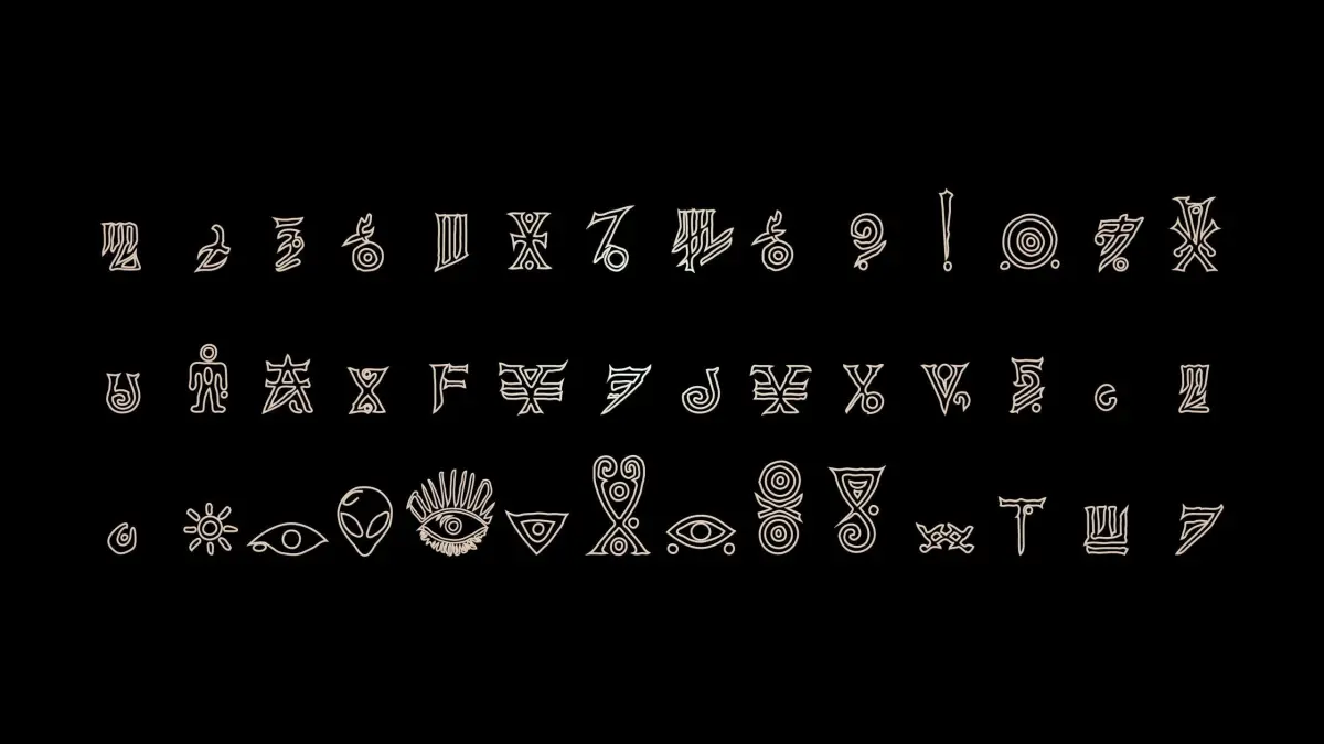 Style: The alphabet and characters are crafted in a minimalistic, tribal, and sci-fi aesthetic, blending ancient symbolic vibes with futuristic alien concepts. Each glyph is designed to feel authentic, evoking the sense of a long-lost extraterrestrial language.