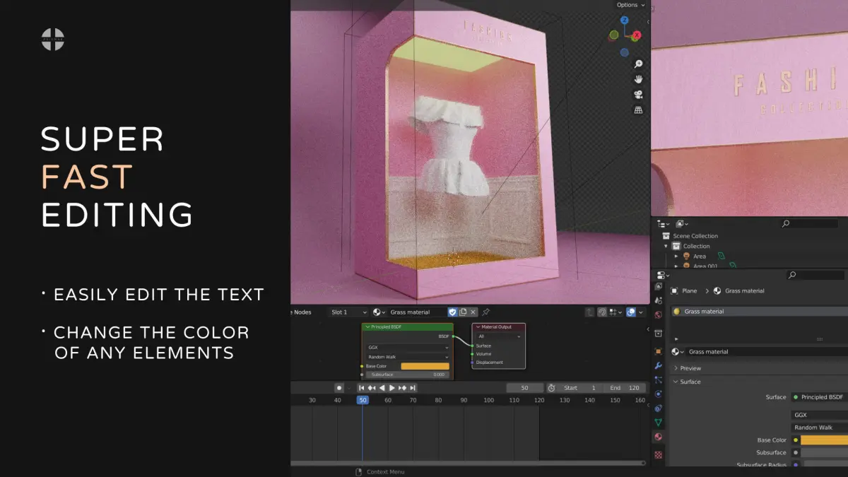 3D animated NFT Fashion box for editing in Blender. Made for rendering in Cycles.You can change all parameters, such as color, text. Quickly attach objects or png files to animation.And also change the background in Blender.