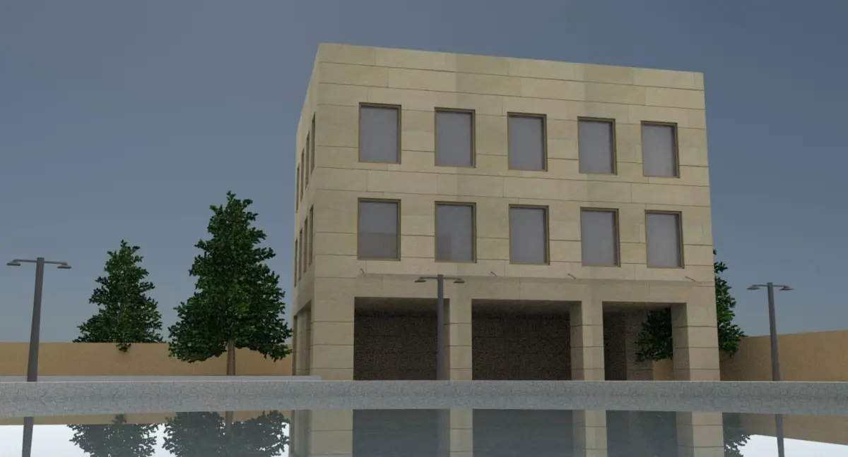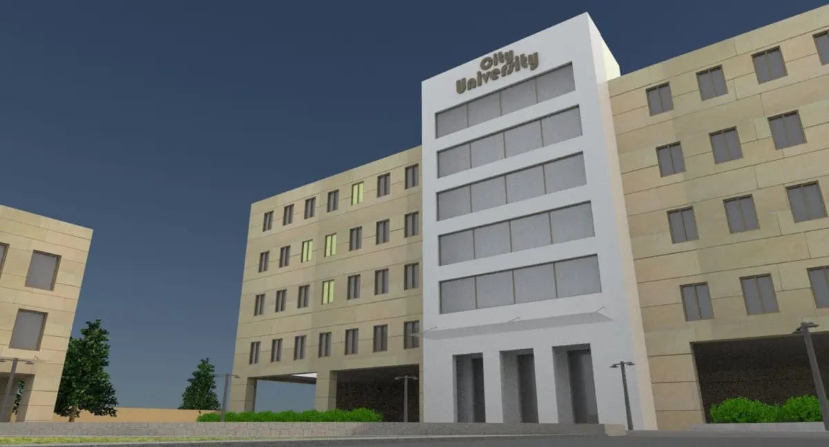 Bring your educational or institutional scenes to life with this realistic 3D model of a modern university campus. The design includes a six-story main university building, two symmetric administrative blocks, a roundabout with a decorative fountain, green landscape elements, and walkways — all styled in a clean, contemporary architectural form.