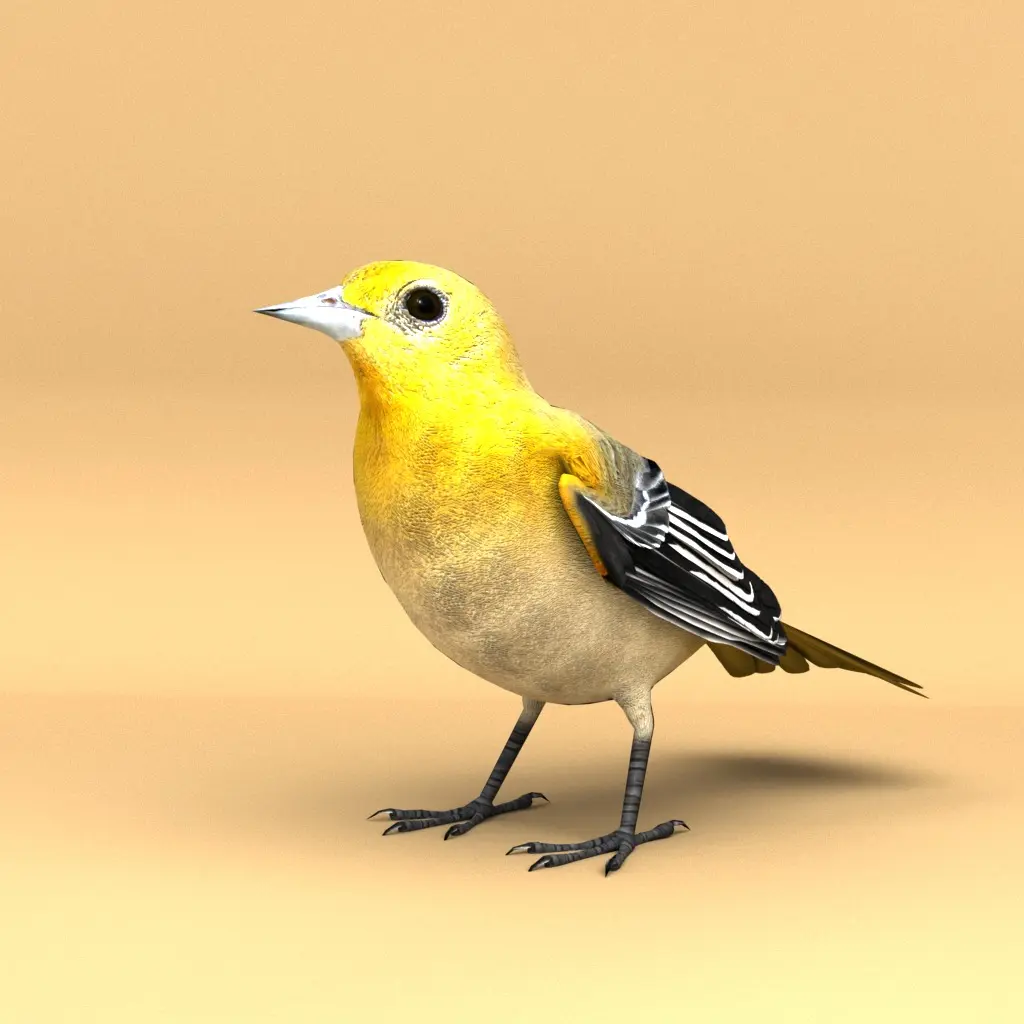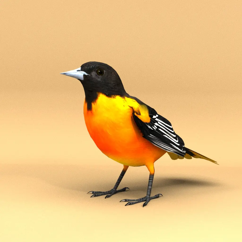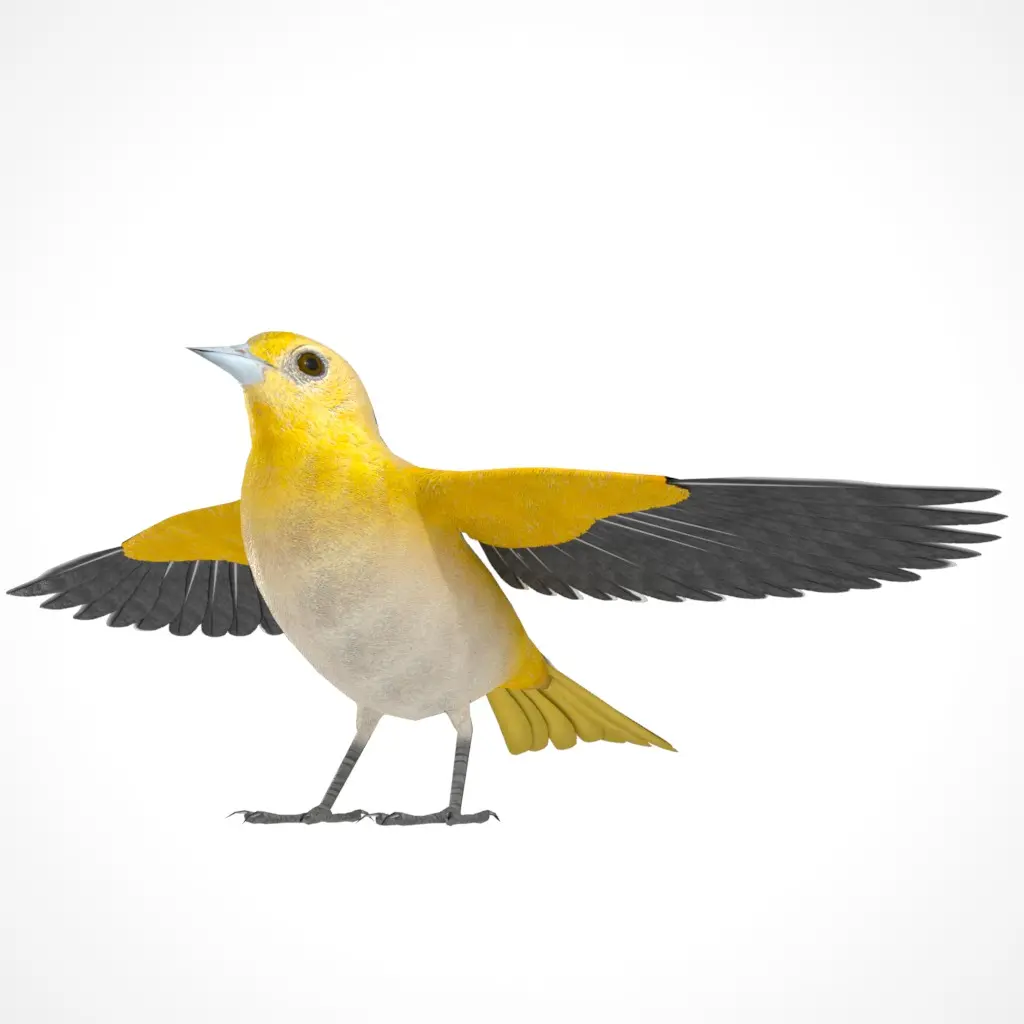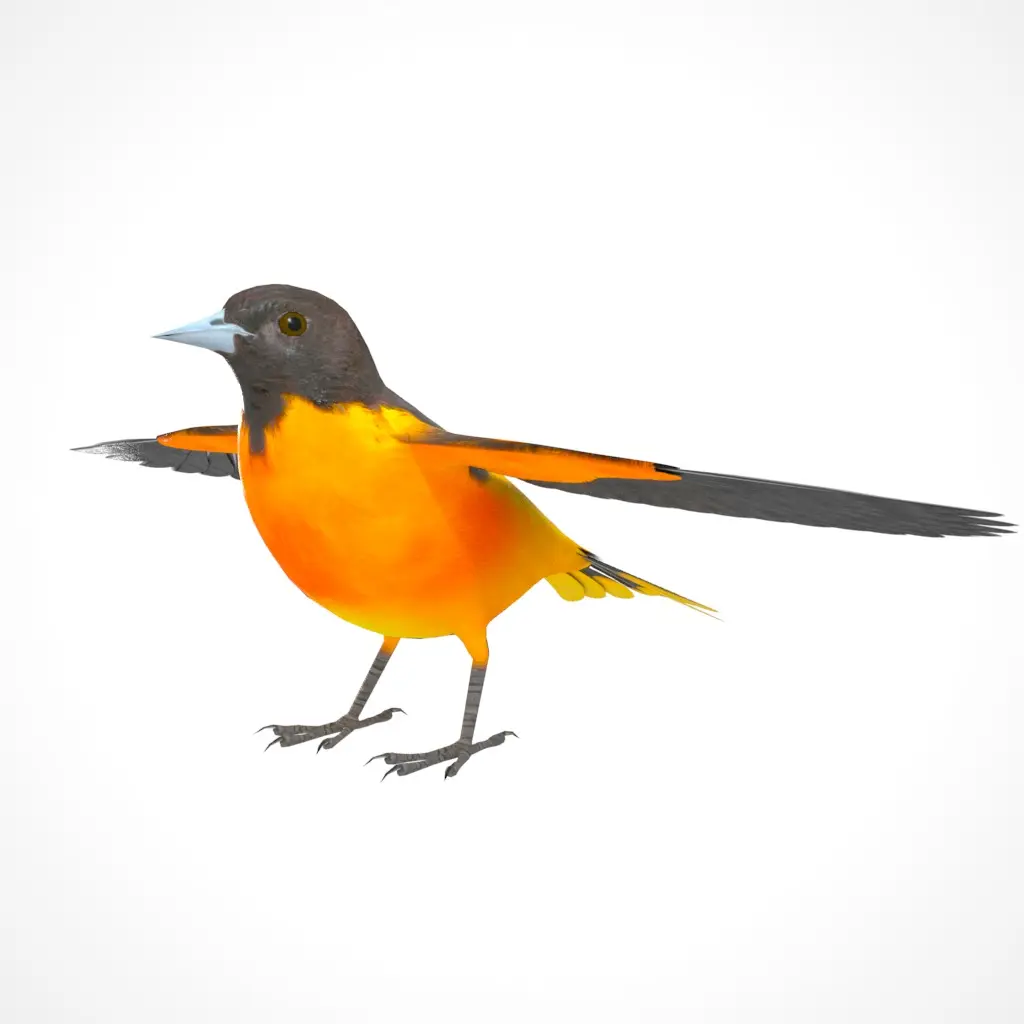 Animated 3D Model of Baltimore Oriole. The model is rigged in Maya and includes various modular animations, perfect for creating custom scenes with ease. You can find both male and female textures included as well as folded and unfolded wing poses. The textures were created with great attention to detail, providing you with accurate and realistic 3D bird models.
