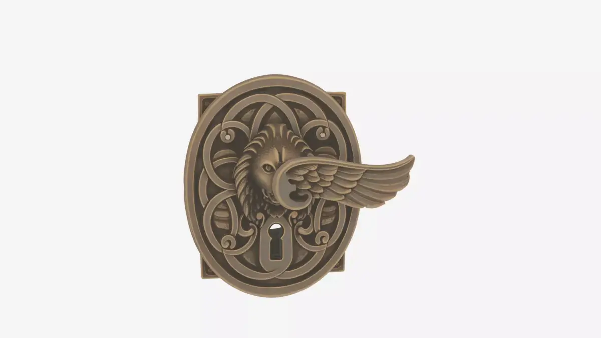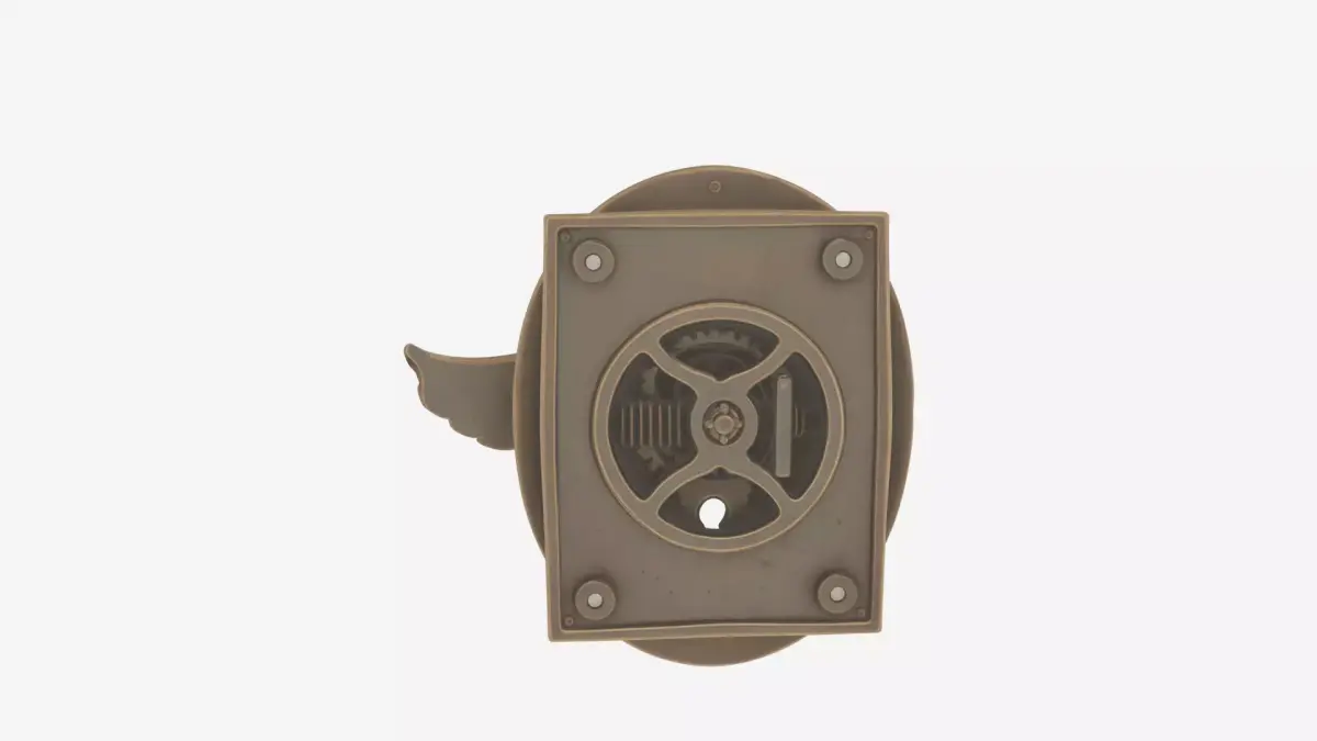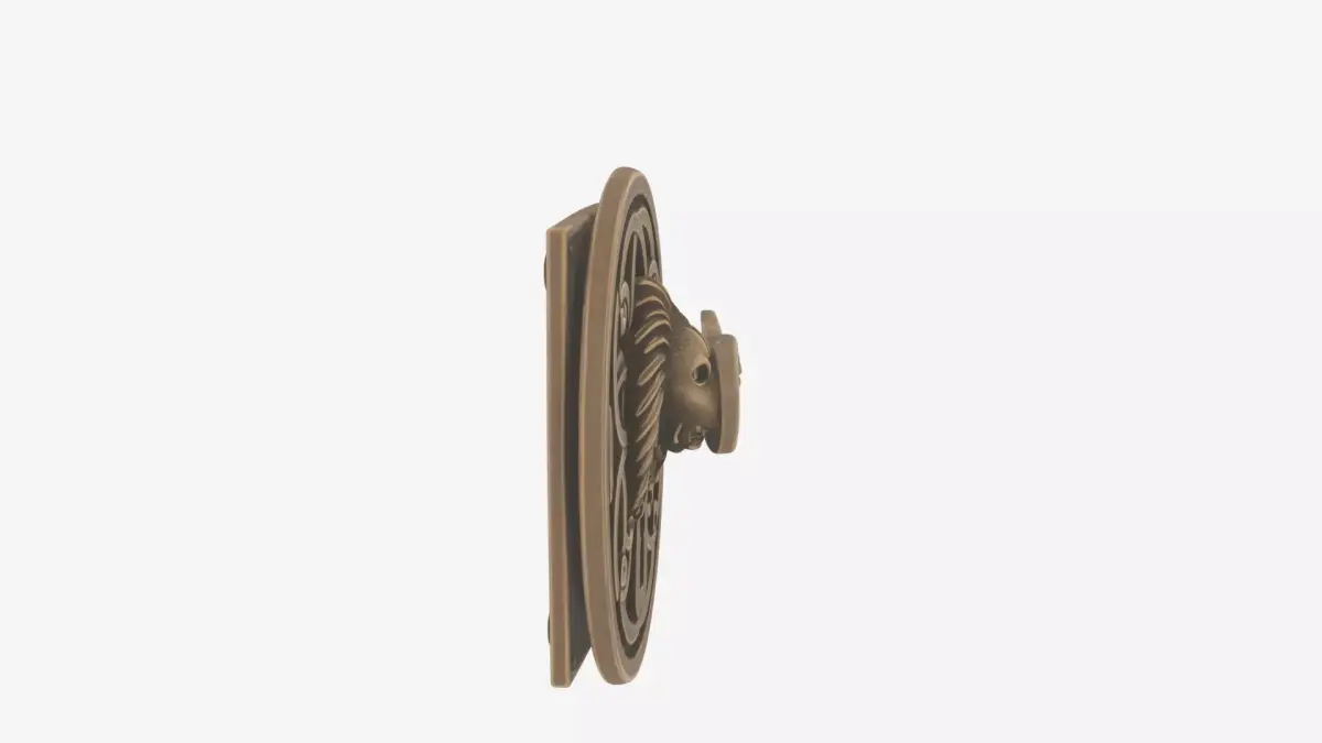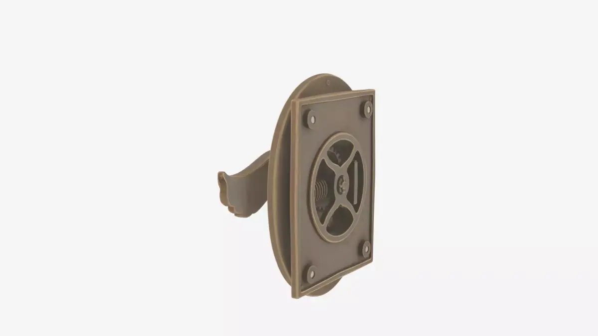 An ornate brass bank door handle featuring an elegant backplate with elaborate scrollwork and a detailed keyhole escutcheon at its center. The substantial lever extends gracefully with a comfortable ergonomic curve while maintaining its historical antique brass finish showing subtle wear patterns and rich patina that speaks of decades of careful use. The rear view A premium leather money clip wallet featuring elegant spring tension mechanism, multiple card slots, and a sophisticated embossed logo. The detailed 3D model
