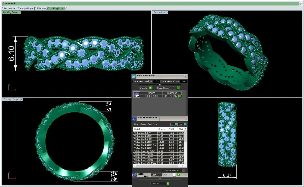 Ring Size Gold Metal Weight in dfferent Karats like 14k, 18k, 22k Gem Stone weight ( Carat Weight ) for all stones in the Model also Quantity of Stones. Dimensions of the Model in mm (millimeter) unit. Delivery Contains 11 files as following :