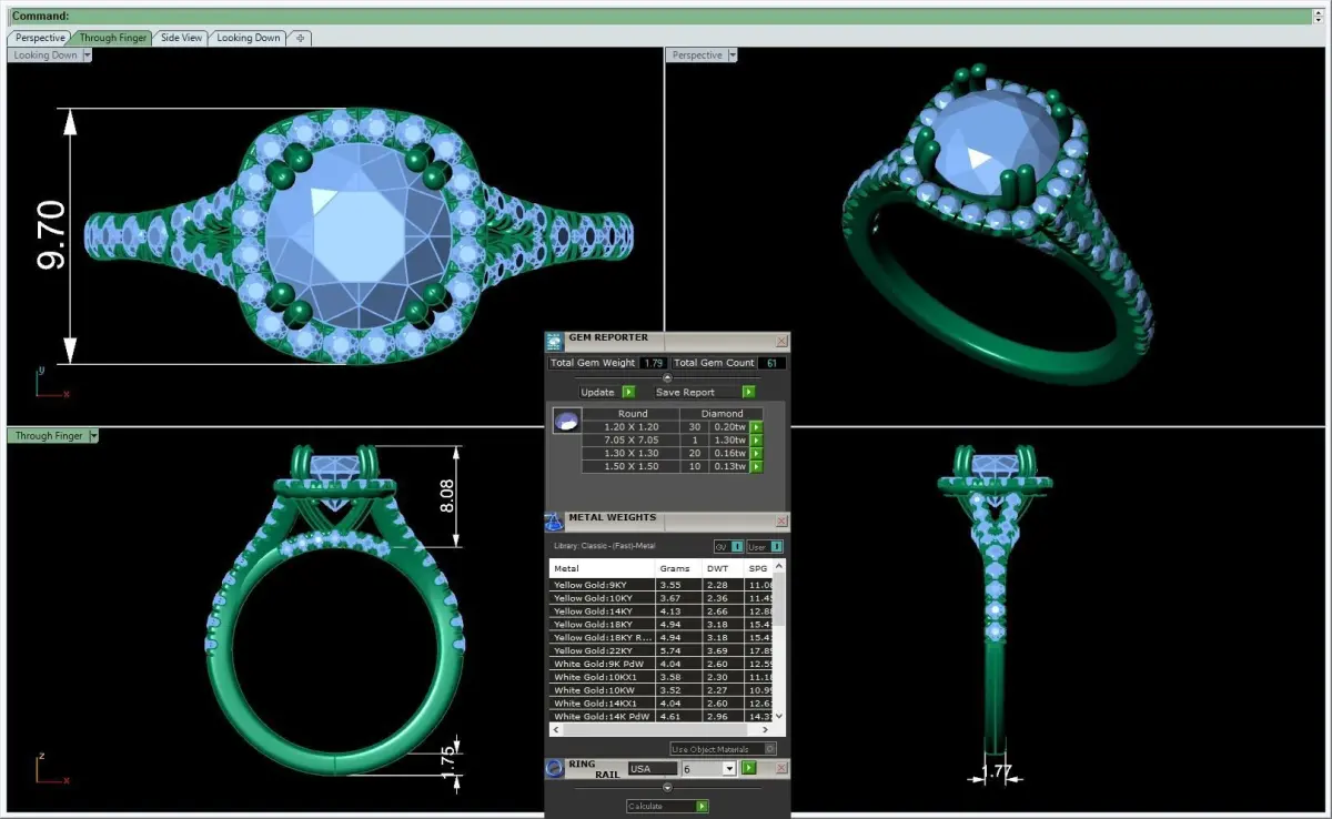 Ring Size Gold Metal Weight in dfferent Karats like 14k, 18k, 22k Gem Stone weight ( Carat Weight ) for all stones in the Model also Quantity of Stones. Dimensions of the Model in mm (millimeter) unit. Delivery Contains 11 files as following :