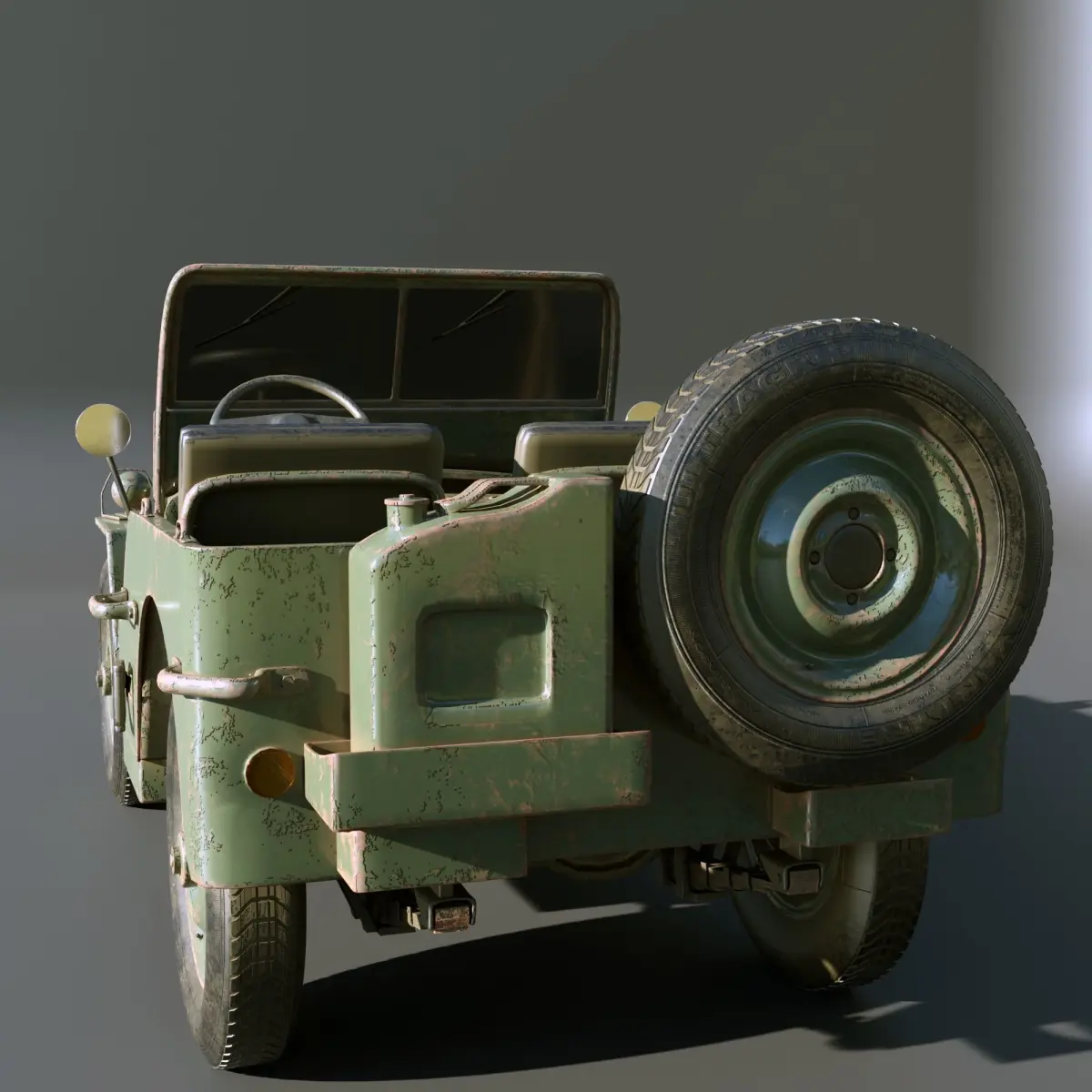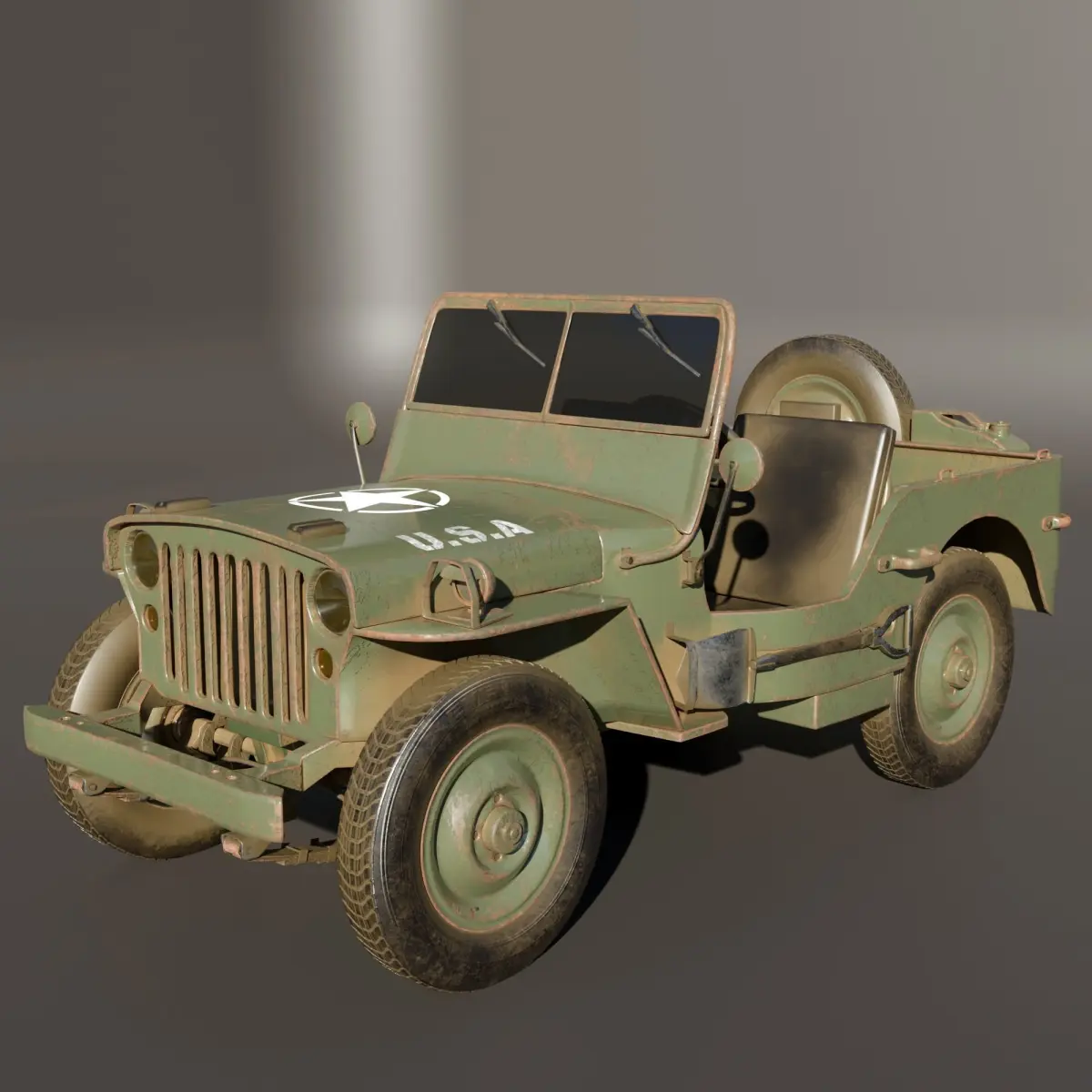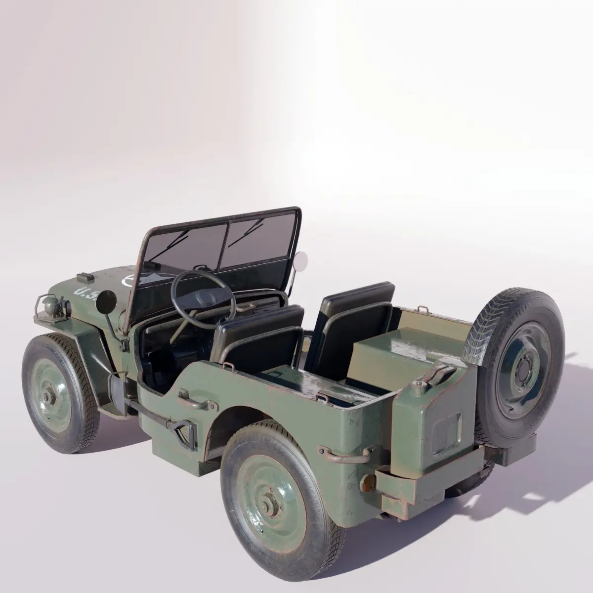 3d car model Willys MB. Realistic model with correct dimensions and proportions. The model is not an exact copy of the car. All details of the model are separated. If the buyer wishes, I can transfer a blender file with the unused modifier of the subdivision surface for easy editing of the model. The textures were applied in the substance painter and consist of three texture sets. Textures: BaseColor, Height, Metallic, Normal, Roughness and for glass opacity. Textures 4096x4096