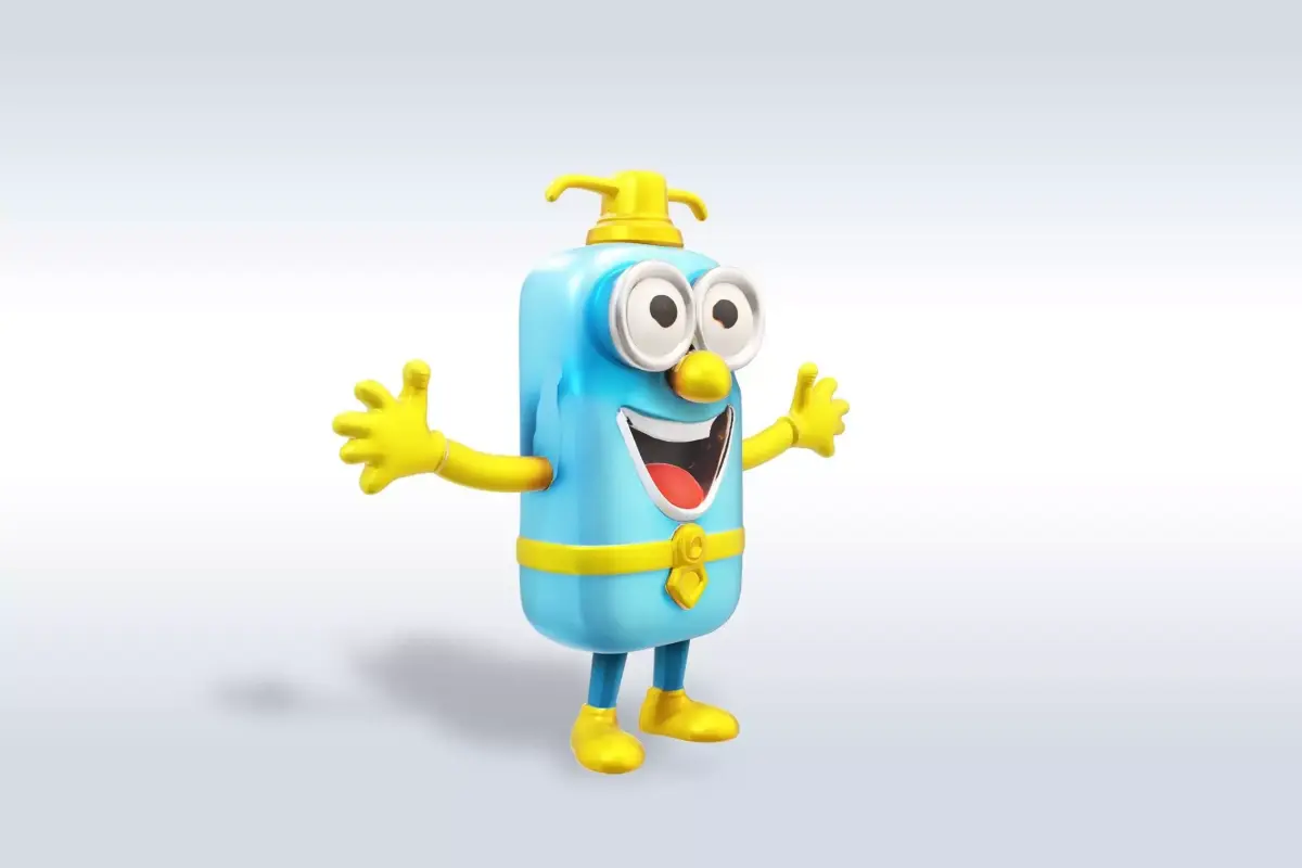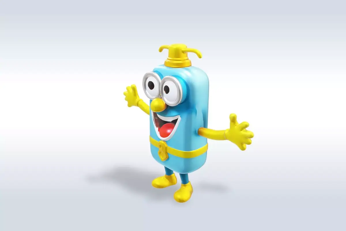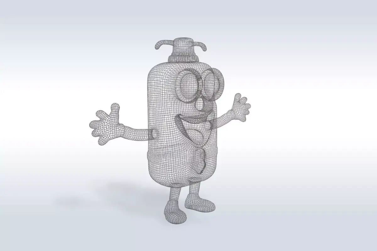 3D model of a flask character dressed in a blue school uniform, suitable for use in various applications such as video games, animations, and visual effects. The character's expression is cheerful and friendly, with a wide smile and big, round eyes, making it ideal for representing a fun-loving and energetic school flask. The character's outfit includes a blue shirt with a yellow tie, a backpack, and orange shoes, adding to the overall impression of a happy and enthusiastic school flask. This model would be perfect for use in educational content, children's apps, or any project that requires a realistic and engaging representation of a young, energetic school flask.