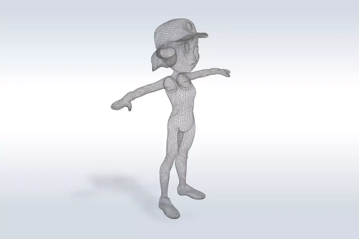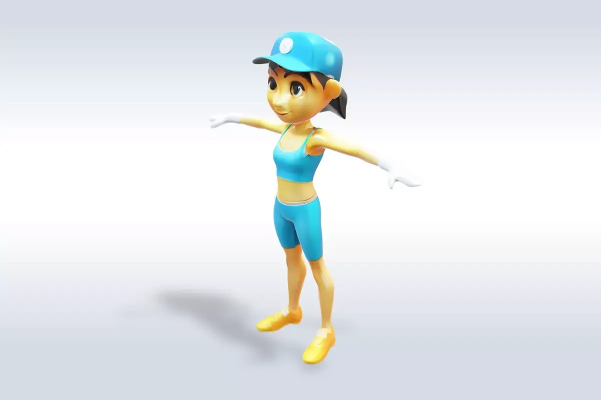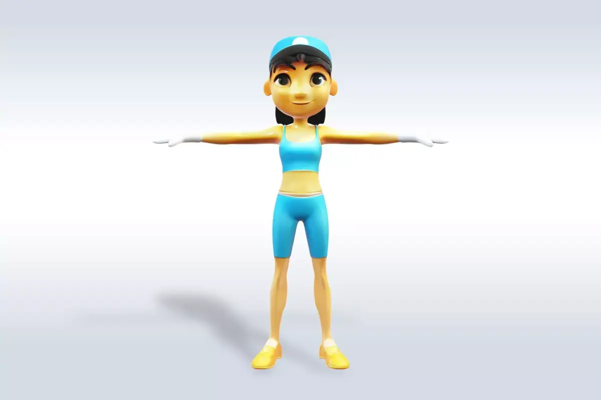 3D model of a young woman dressed in a pink sports bra and blue shorts, suitable for use in various applications such as video games, animations, and visual effects. The character's physique is athletic and toned, with a well-defined waist and slim legs, making it ideal for representing a fitness enthusiast or a professional athlete. The character's expression is confident and determined, adding to the overall impression of strength and athleticism. This model would be perfect for use in sports-related content, fitness apps, or any project that requires a realistic and engaging representation of a fit female character.
