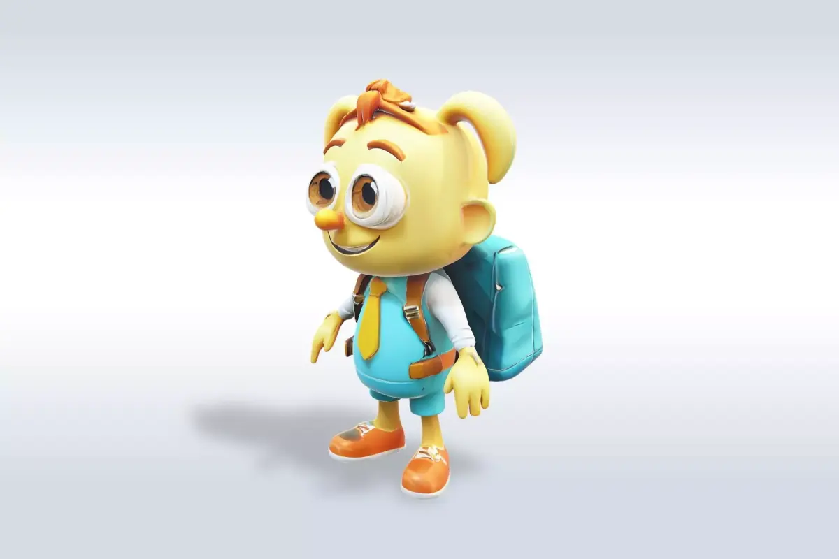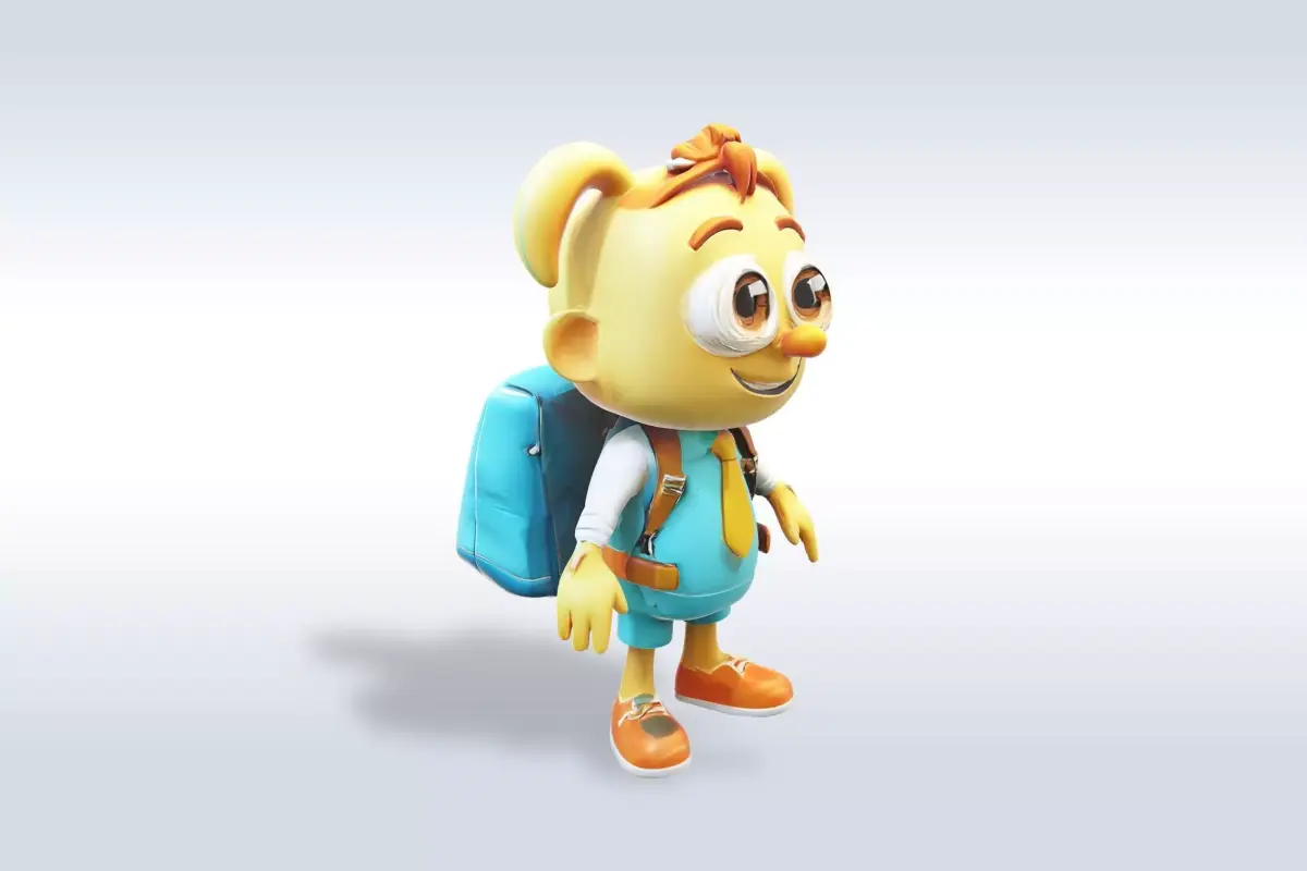 This image showcases a highly detailed and realistic 3D model of a young girl dressed in a blue school uniform, suitable for use in various applications such as video games, animations, and visual effects. The character's expression is cheerful and friendly, with a wide smile and big, round eyes, making it ideal for representing a fun-loving and energetic student. The character's outfit includes a blue shirt with a yellow tie, a backpack, and orange shoes, adding to the overall impression of a happy and enthusiastic school girl. This model would be perfect for use in educational content, children's apps, or any project that requires a realistic and engaging representation of a young, energetic student.