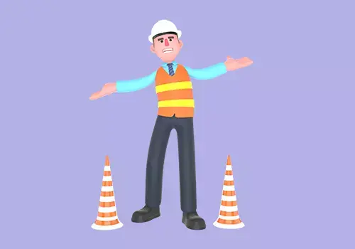 This 3D cartoon style male architect character is depicted standing between two orange-and-white traffic cones with both arms stretched open to the sides, expressing anger and frustration. His strong stance and expressive face convey a sense of stress or dissatisfaction, making him perfect for construction-themed or workplace conflict scenes.