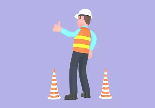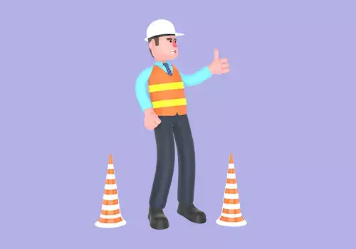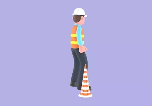 This 3D cartoon style male architect character is shown standing between two orange-and-white traffic cones while raising his left hand to give a “thumbs up” gesture. Despite the positive sign, his facial expression shows anger and displeasure, creating a humorous contrast that adds personality to any project.