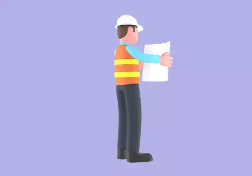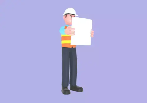 This 3D cartoon-style male architect character stands facing forward, holding a large document with both hands in front of him. His cheerful and grinning facial expression conveys satisfaction, excitement, or pride, making him perfect for scenes celebrating project completion, achievements, or successful presentations.