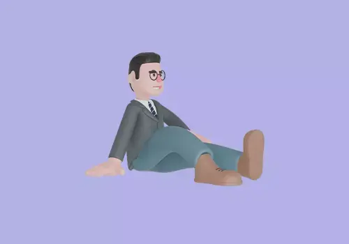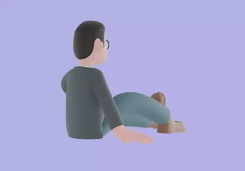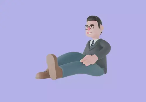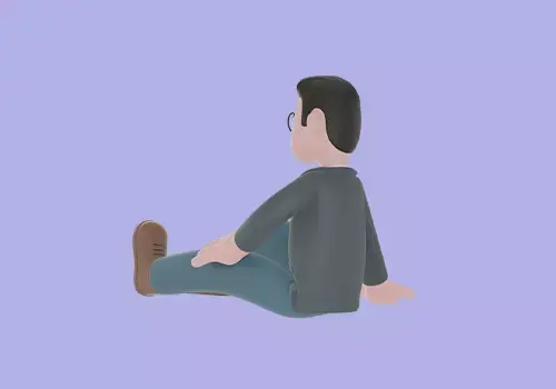 A 3D cartoon-style male teacher character sitting on the floor with one leg stretched forward while leaning back on one hand for support. He appears relaxed, calm, and resting, giving off a casual and approachable vibe.