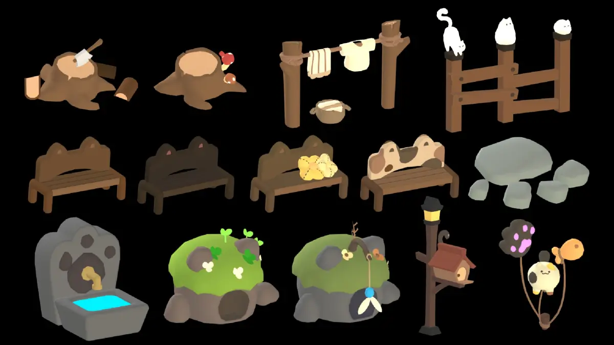 • Ball • Barrel (X3)• BasketCusion • Bench (X4) • Bottle • Bowl • Camfire • CatBalloon • CatHead (X2) • CatHouse (X3) • CatLamp • CatTower • Coconut • Faucet • FishToy • Flower (X6) • Frisbee • GroundPaw • Lamp (X7) • Laundry • LoadSign (X4) • Lute • Magazine • Mat (X2) • PaperBag (X2) • Planter (X2) • Plants (X6) • PostBox (X3) • RoadSign • Rock (X4) • Sandal • SandCatHead • Shell • Shovel • SignPost (X4) • Starfish • StoneHouse (X2) • Stool • Stimp (X2) • Swing • Tree (X3) • Tube (X2) • Wateringpot • Waterpump