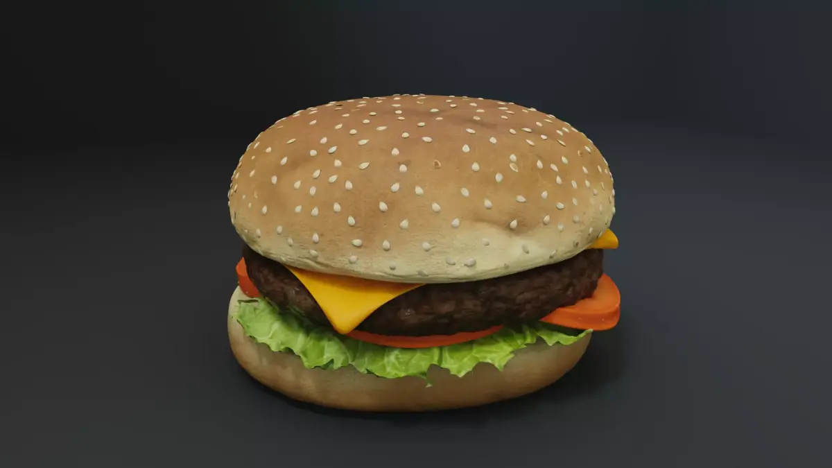 A highly detailed, photorealistic 3D model of a cheeseburger, perfect for close-up shots, animations, and product visualization.