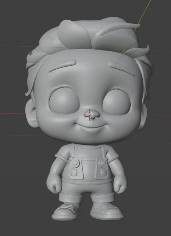 Stylized 3D model of an adorable chibi boy, with a charming, childlike appearance and large, expressive eyes. Wearing light-colored overalls, a t-shirt, and sneakers, this character is ideal for 3D printing collectibles, animations, avatars, or cartoon-style dioramas.