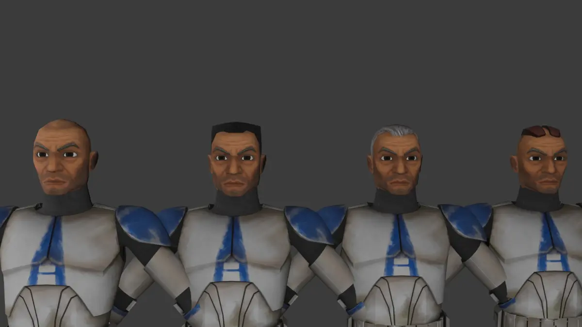 This high-quality 3D model shows a detailed Clone Trooper of the 501st Legion, inspired by the style of the popular Star Wars: The Clone Wars animated series. The model is ideal for games, animations, fan projects or 3D printing.