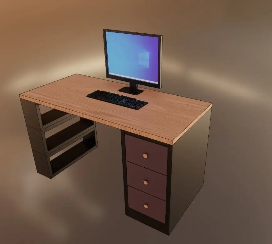 Computer Table - Wooden PC Desk Table - Corner Desk 3D modelThis set:1.file Blender2.file obj standard3.Materials and Textures:Native format model format Blender 3.4.0, Rendered in Eevee, also it has the format BLEND, OBJ, FBX, STL.Model not intended for subdivision.Light & Camera in the scene.Geometry - verts: 1,127, faces:9074, tris: 1802