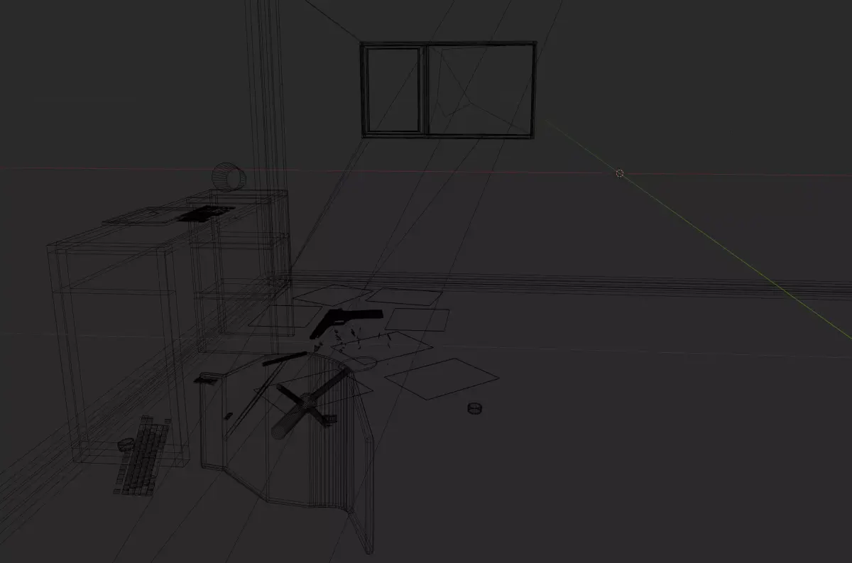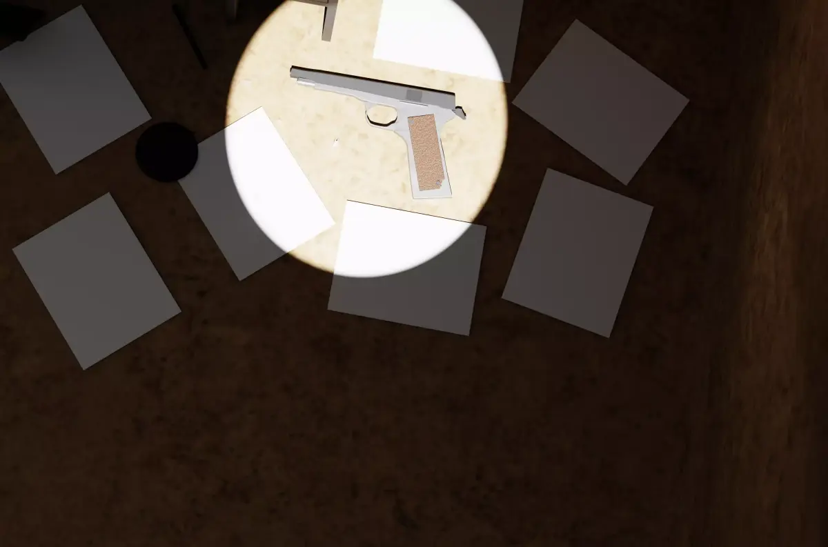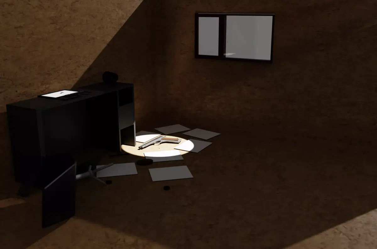 A detailed 3D interior enviroment with a chaotic atomsphere. the scene shows a messy workplace with scattered objects, overturned items and dramatic lighting that draws attention to a hundgun on the floor