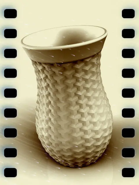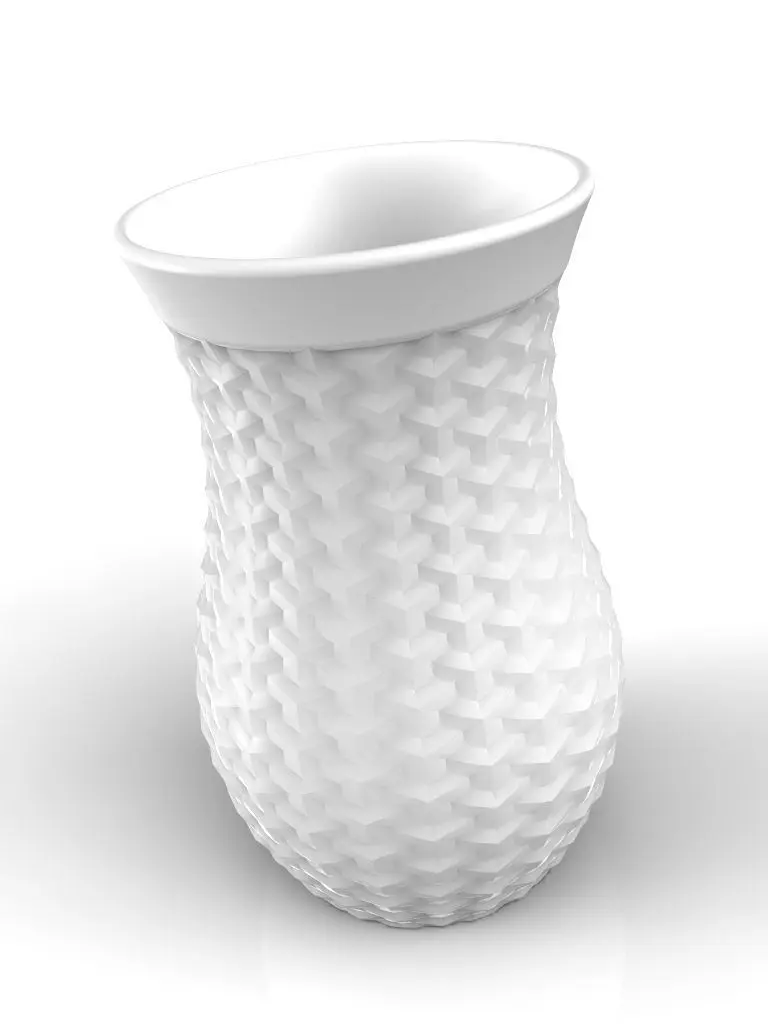 The motif of the surface of the vase is made up of a series of 3D cubes intersecting one another to create a visual pattern.