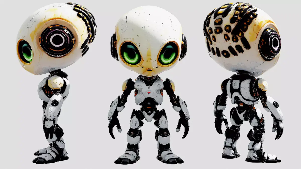Head: elongated and asymmetrical; one side shows exposed circuits under translucent skin.
