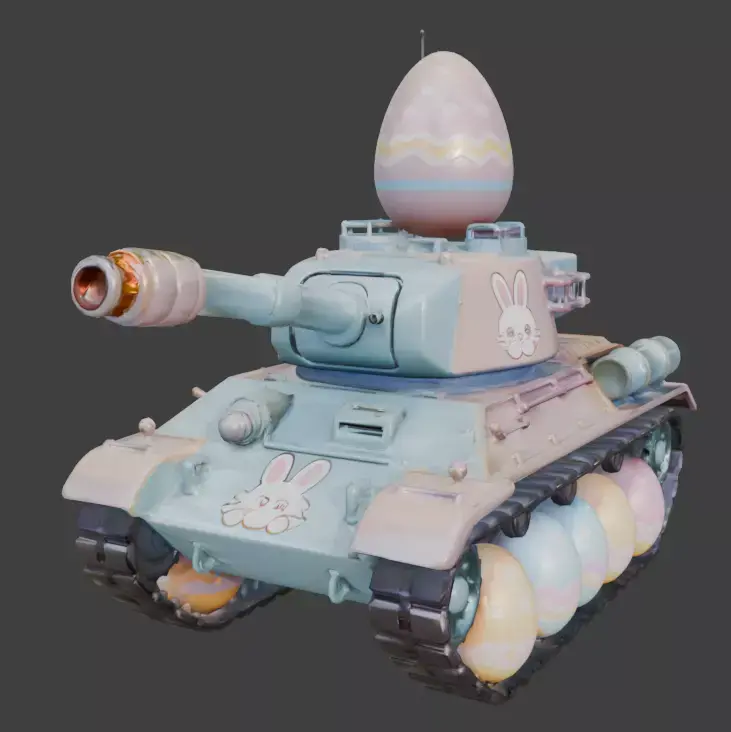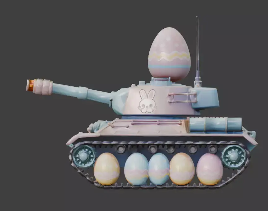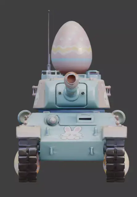TAGSEaster Tank, 3D Model, Military Vehicle, Stylized, Pastel, Mint Green, Pink, Blue, Festive, Holiday, Bunny Decal, Floral, Giant Egg, Egg Wheels, Armored Vehicle, Cannon, Tracks, Whimsical, Creative, High Detail, Rendering, Digital Art, Game Asset, Toy-like, Seasonal, Spring, Heavy Machinery, Character Design