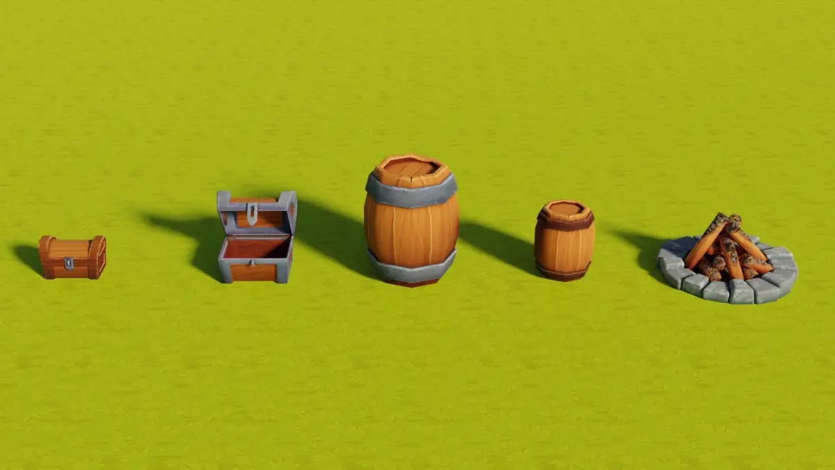 4 - water bucket variations2 -barrel variations9 - essential hand tools2- storage chest variations3 - stairs and ladder variations (modular)