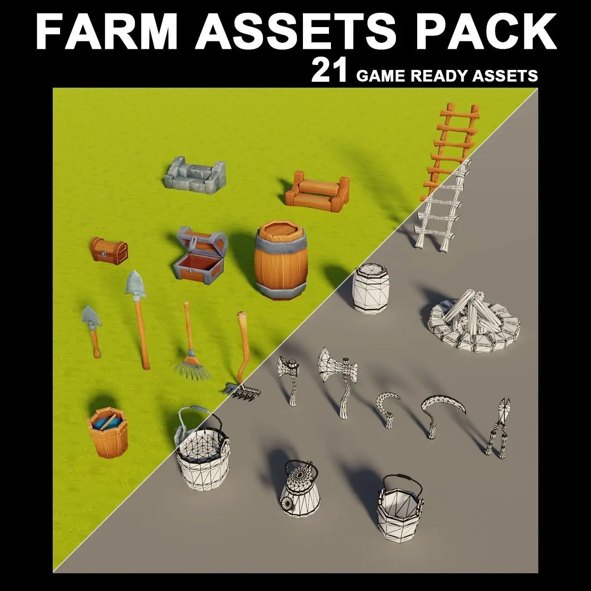 Collection includes 21 lowpoly stylized models with textures, colours & materials. Contains all basic farm equipments.