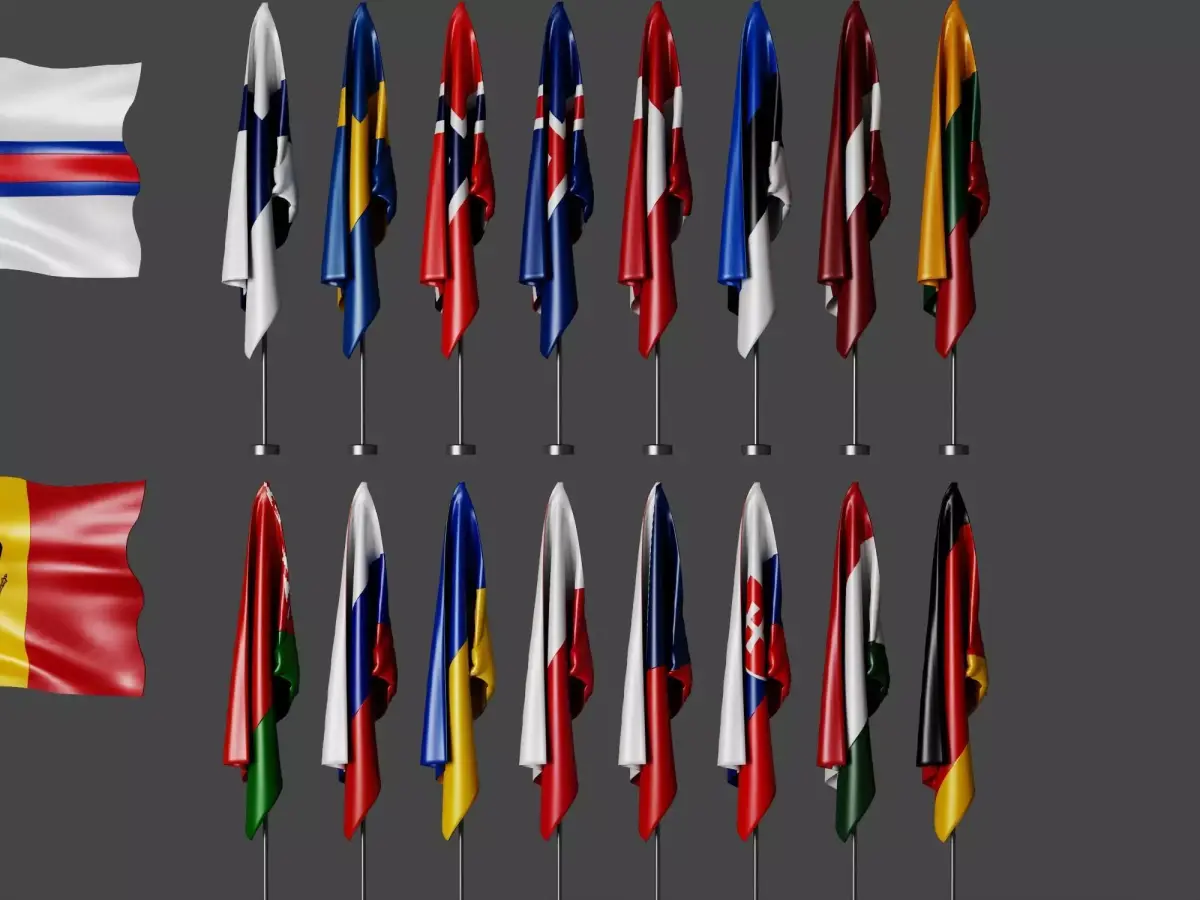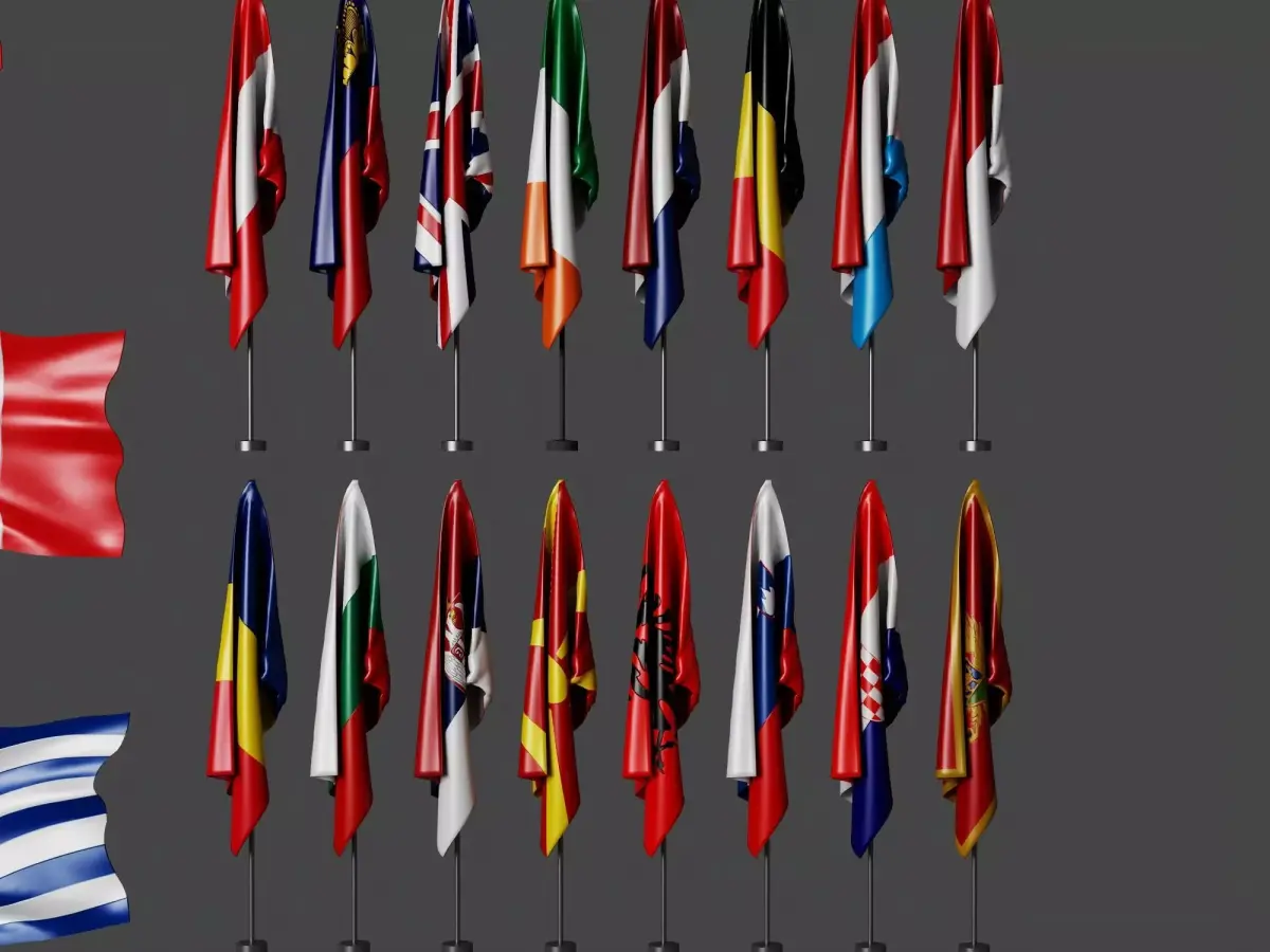 A complete collection of 3D flags for different countries, highly detailed and realistic for use in games, architectural renders, and simulations. Each flag is modeled in high-quality geometry, with realistic materials and textures for versatile applications in visualizations.