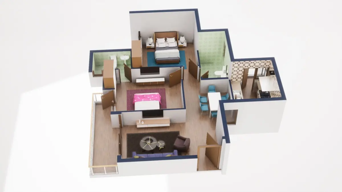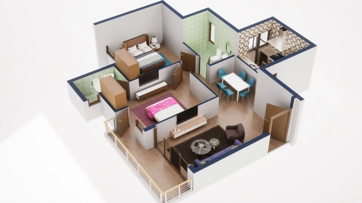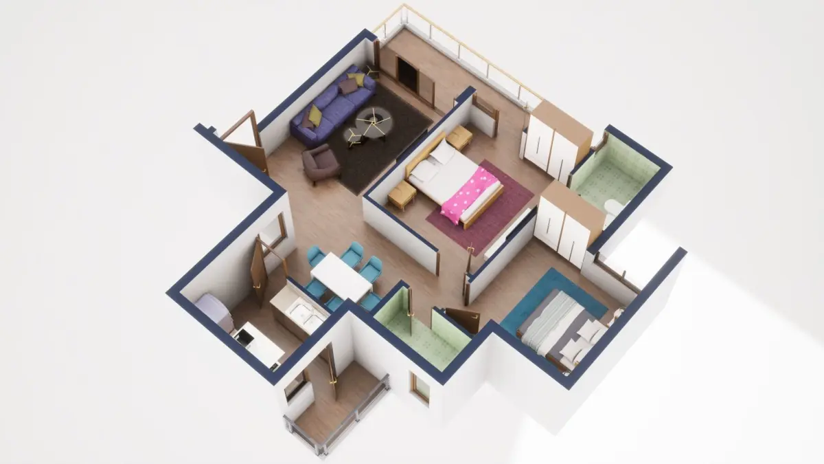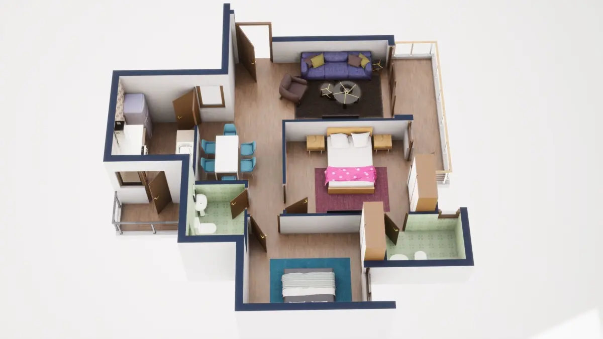 Fully textured 3D model for 1BKH floor plan made in blender.