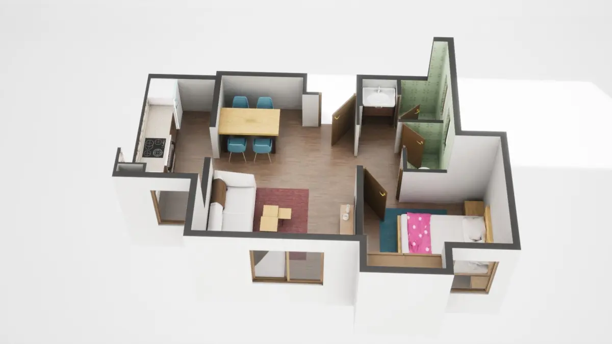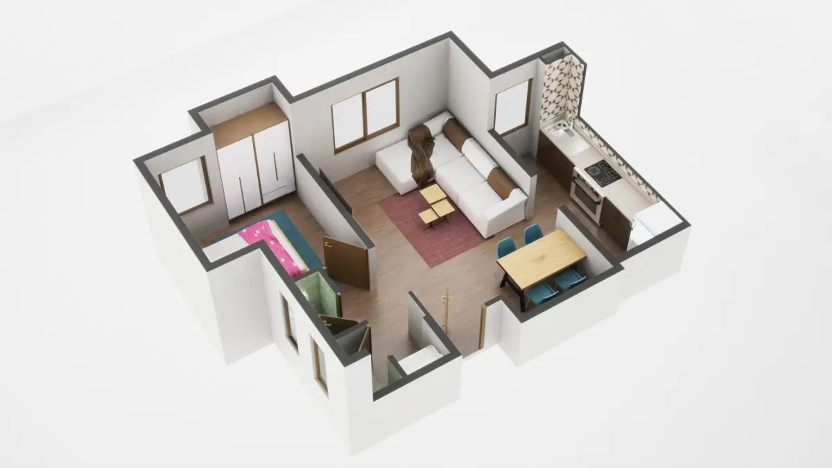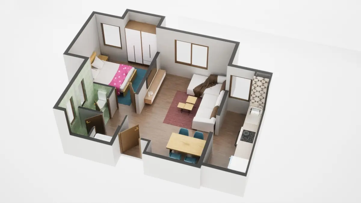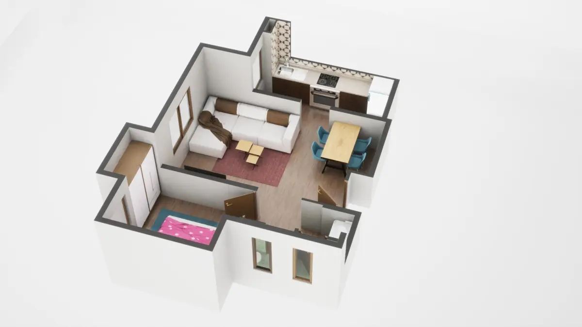 Fully textured 3D model for 1BKH floor plan made in blender.