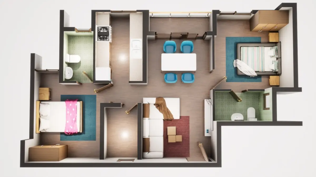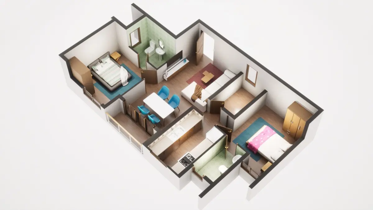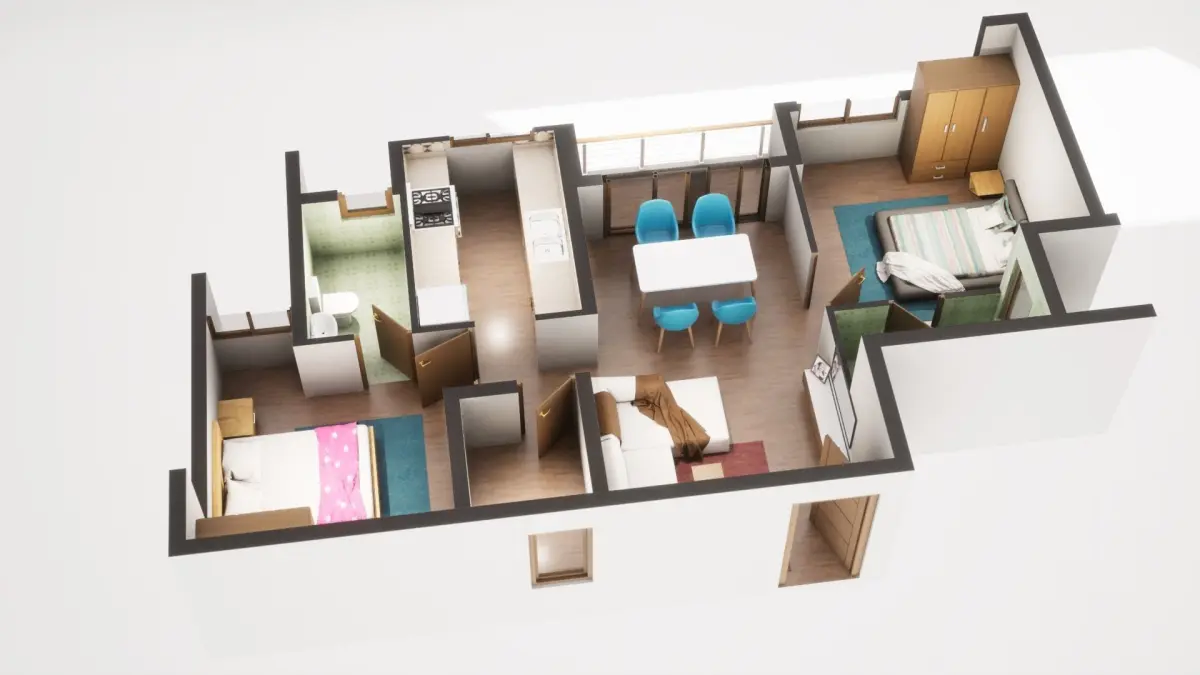 Fully textured 3D model for 1BKH floor plan made in blender.