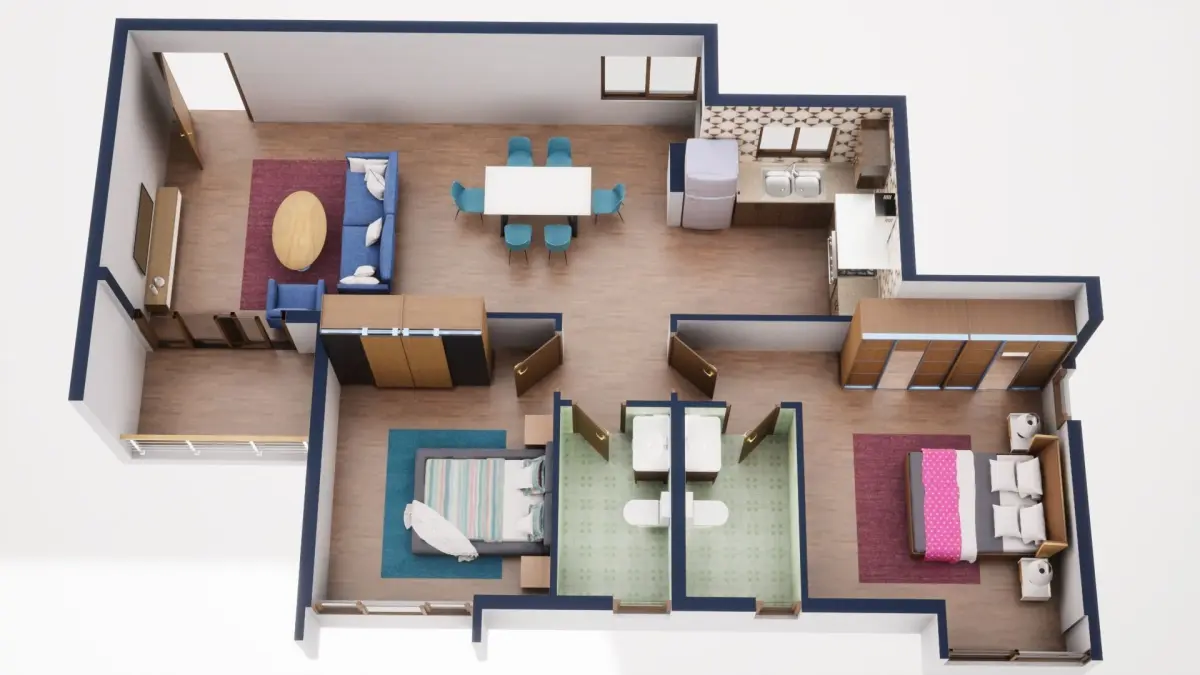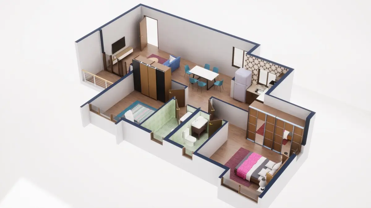 Fully textured 3D model for 1BKH floor plan made in blender.