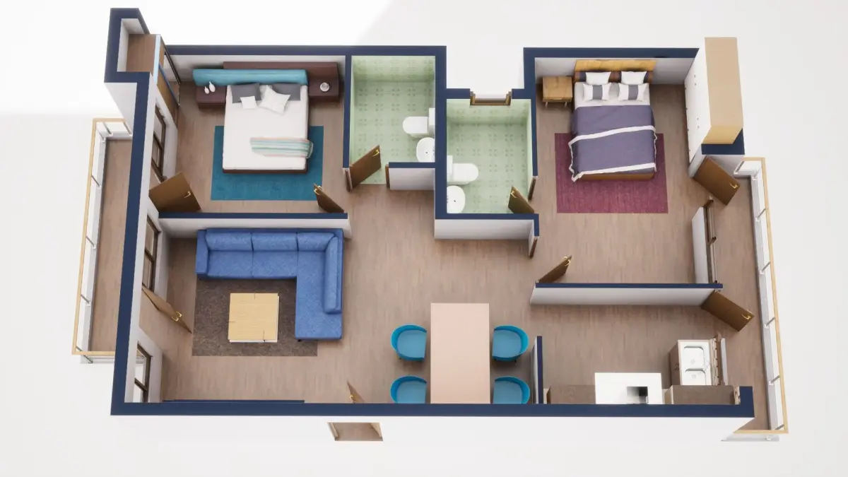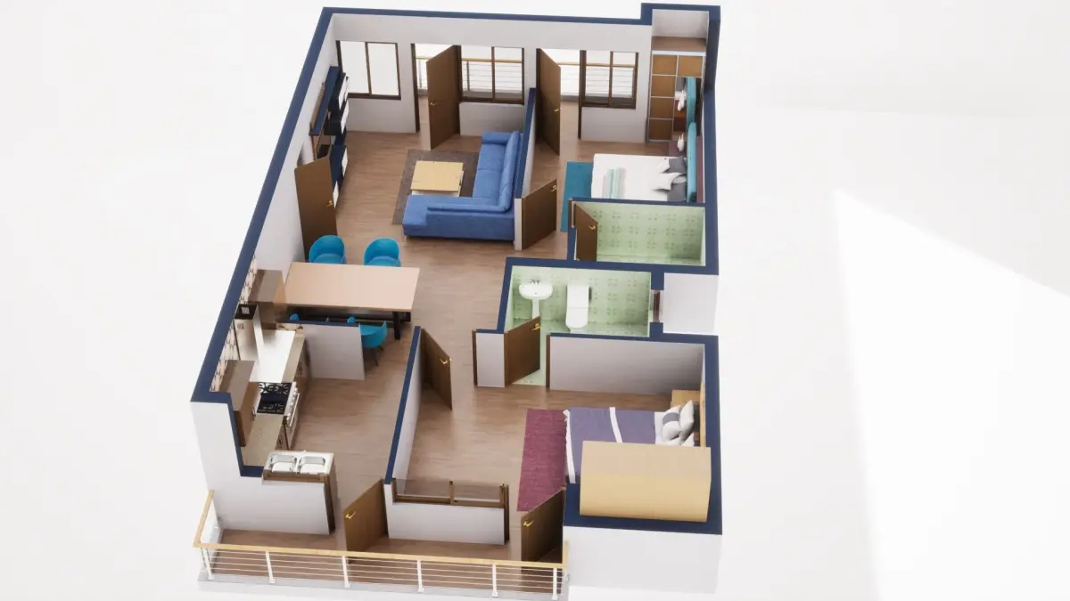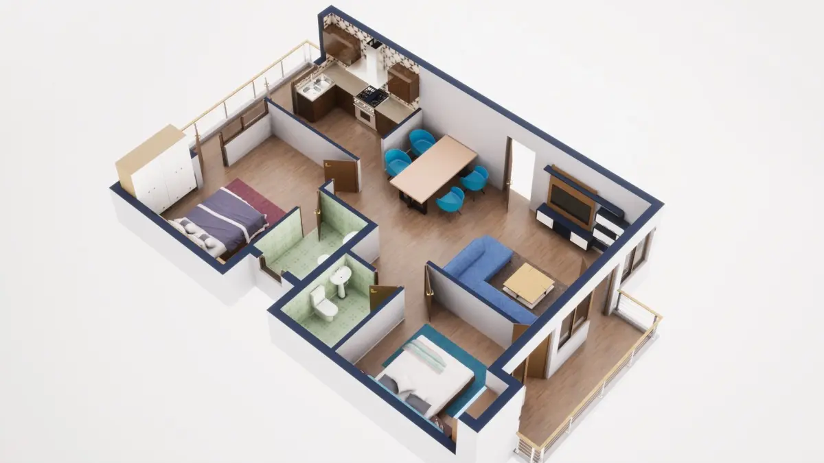 Fully textured 3D model for 1BKH floor plan made in blender.