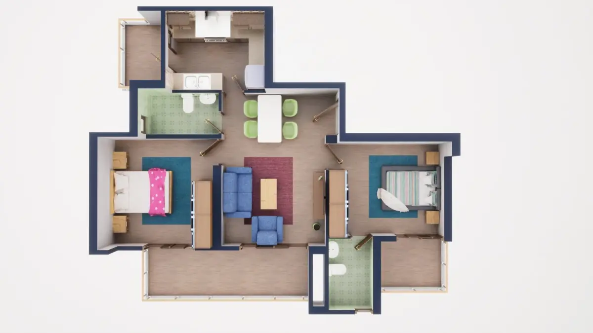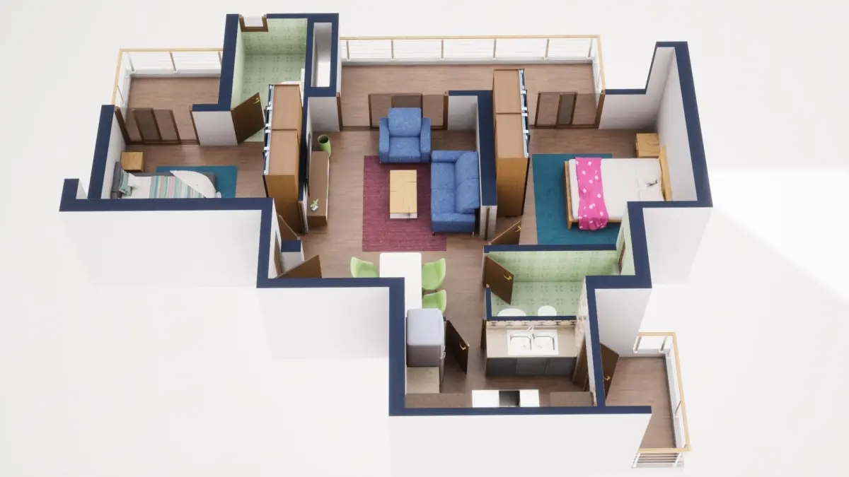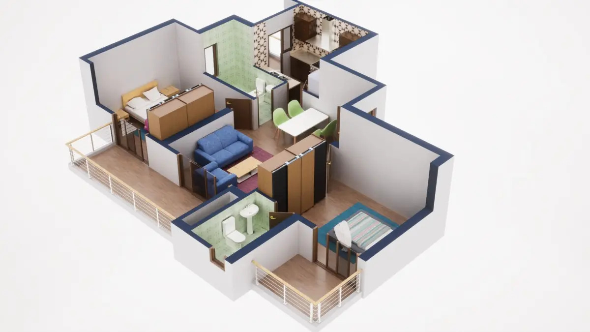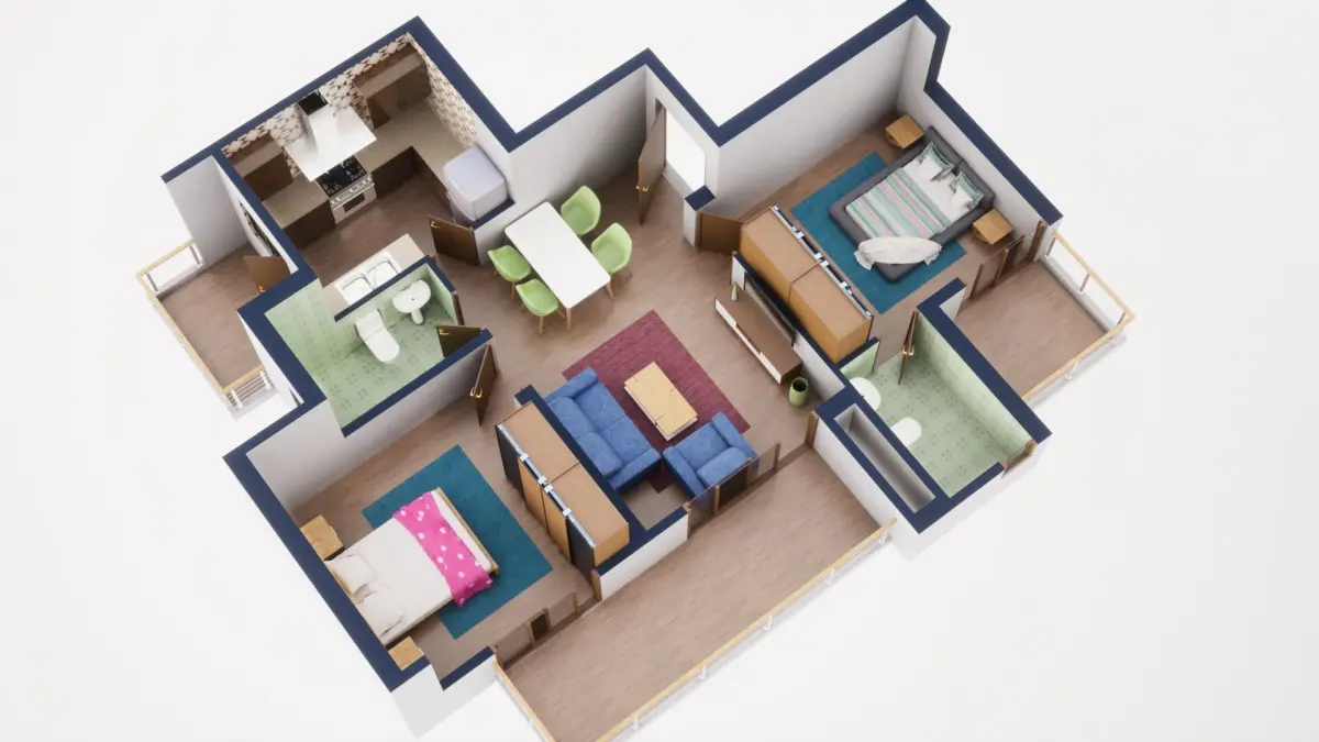 Fully textured 3D model for 1BKH floor plan made in blender.