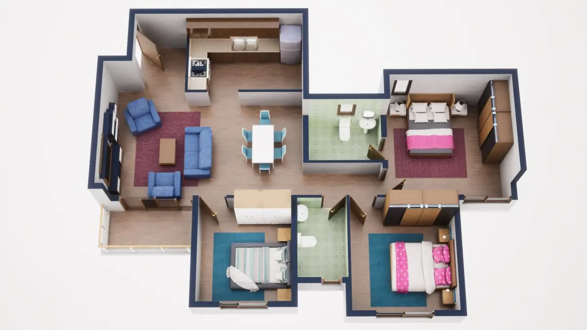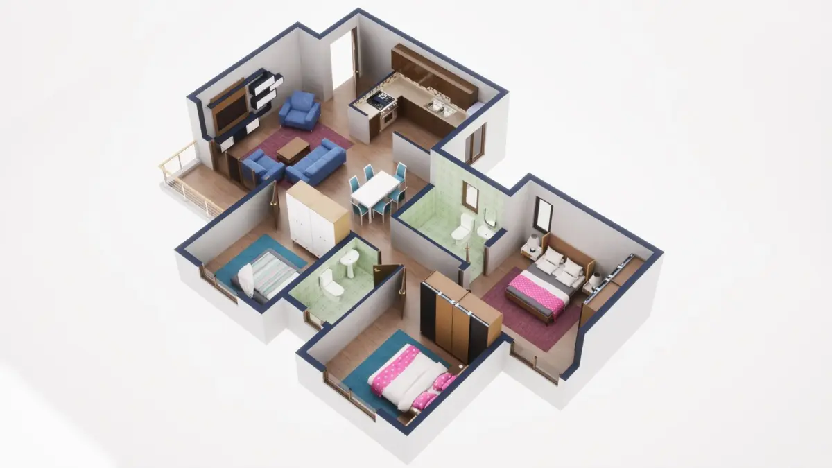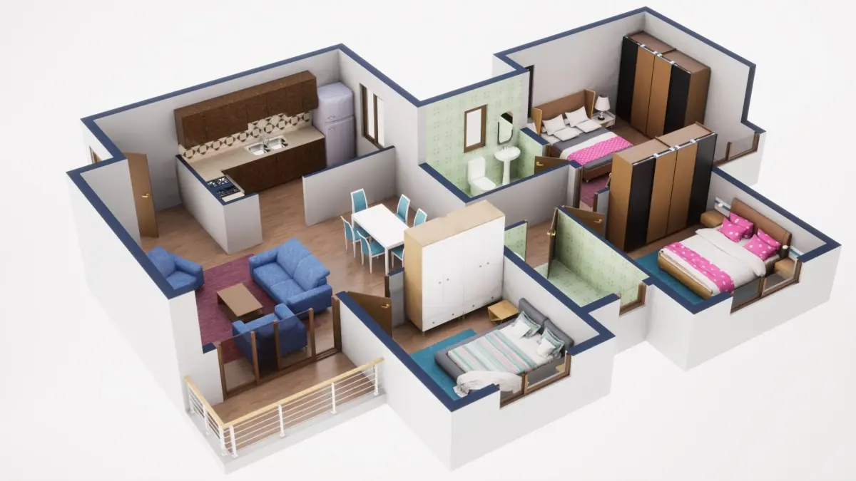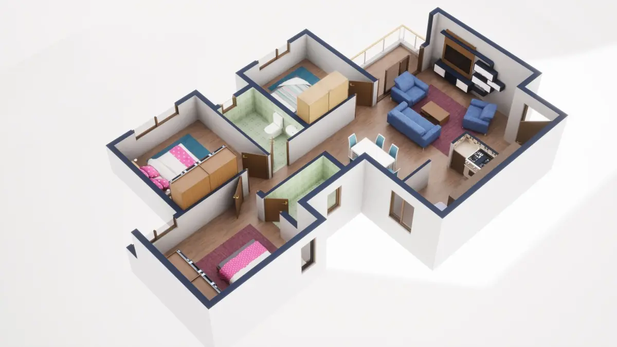 Fully textured 3D model for 1BKH floor plan made in blender.