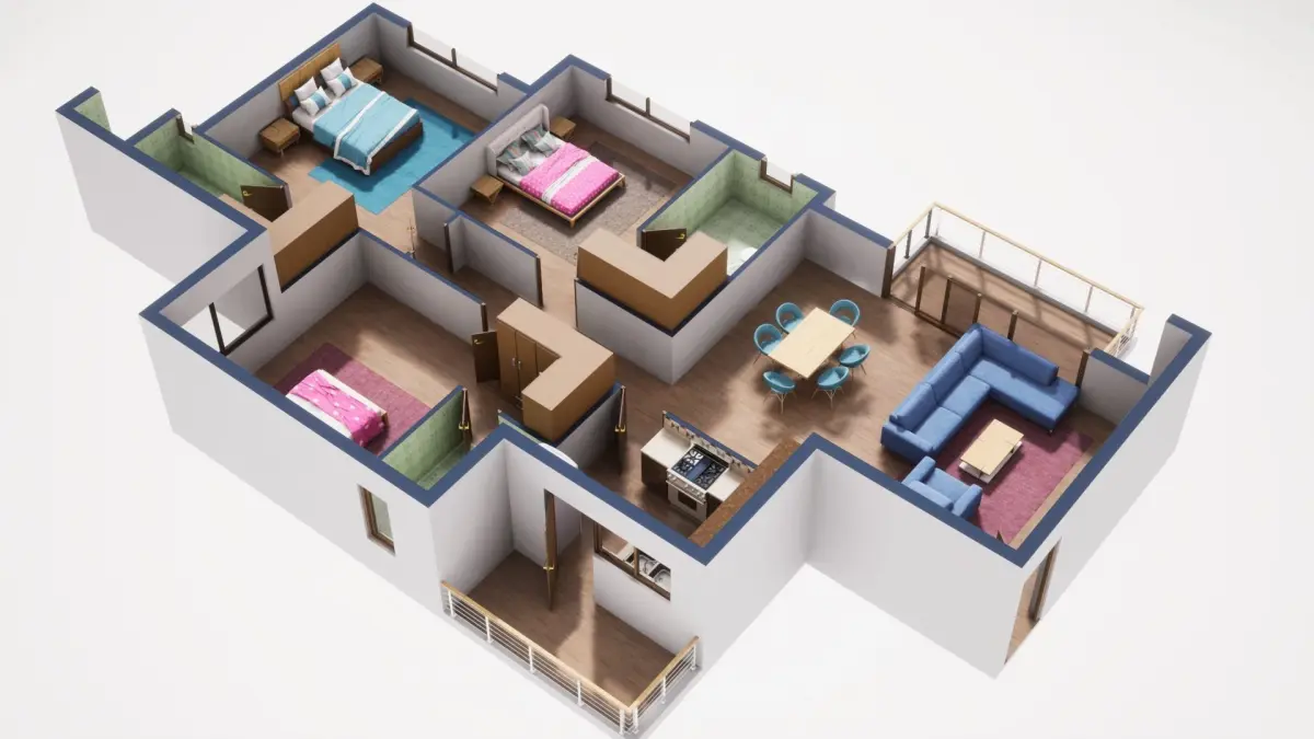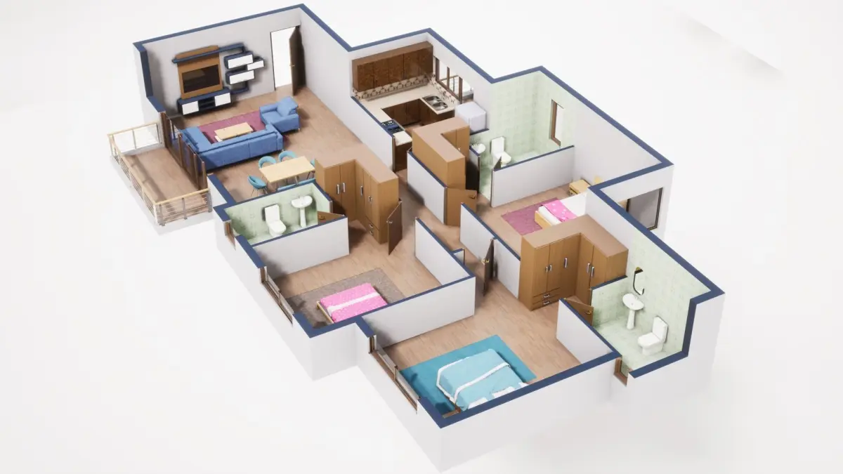Fully textured 3D model for 1BKH floor plan made in blender.