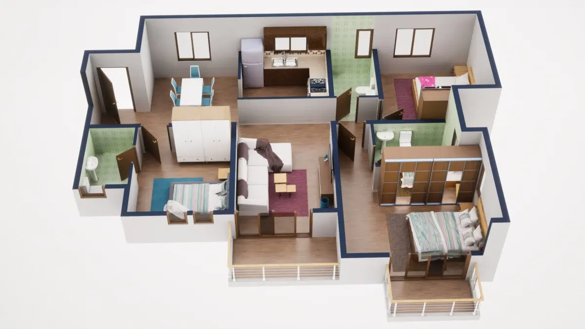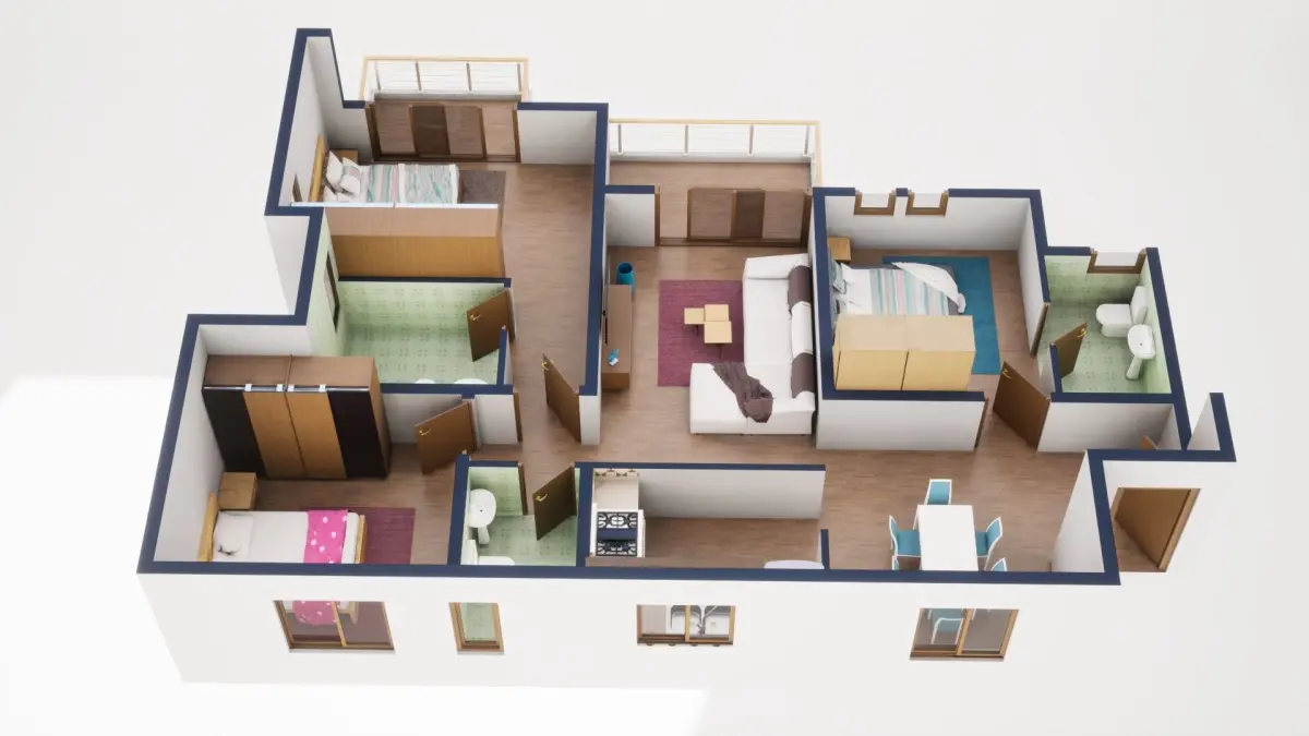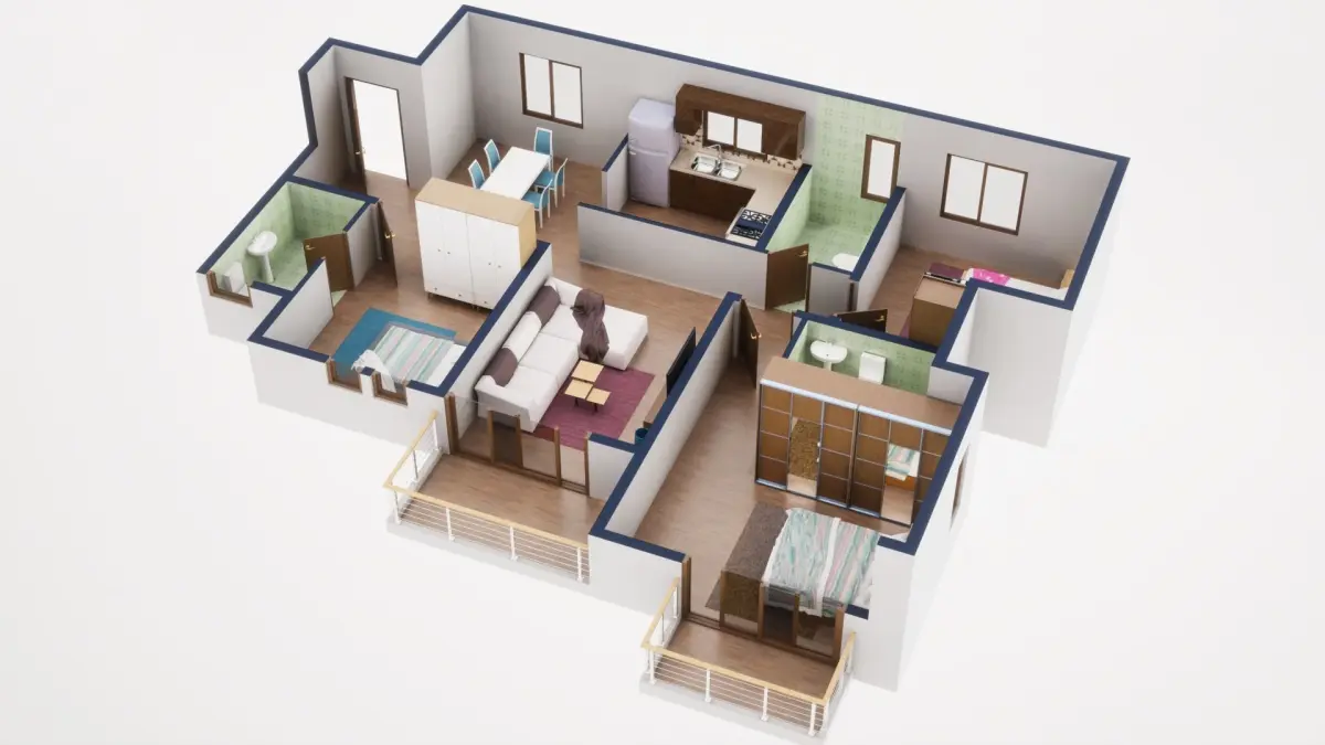 Fully textured 3D model for 1BKH floor plan made in blender.