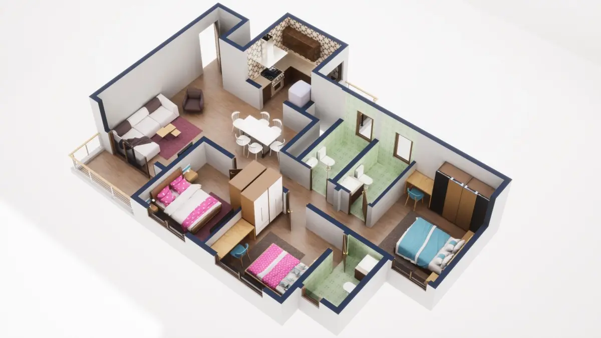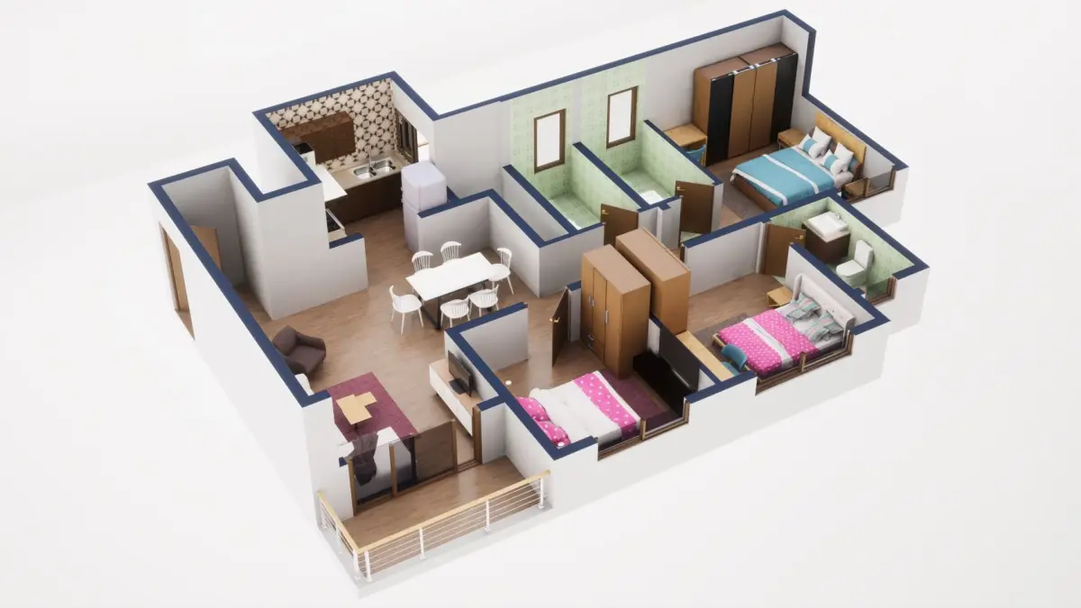 Fully textured 3D model for 1BKH floor plan made in blender.