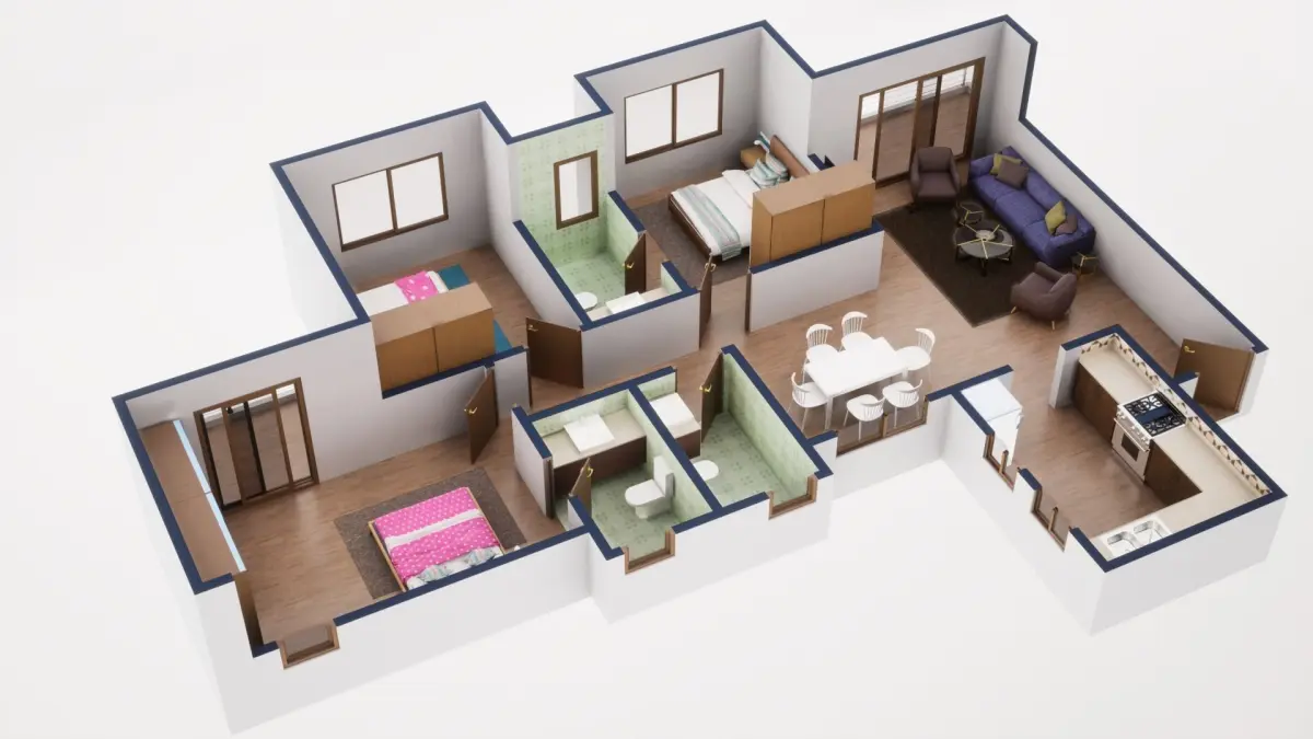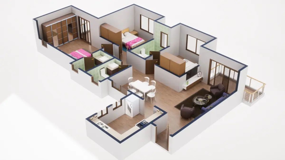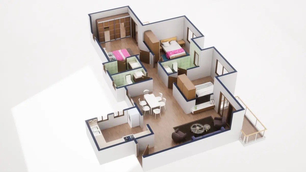 Fully textured 3D model for 1BKH floor plan made in blender.