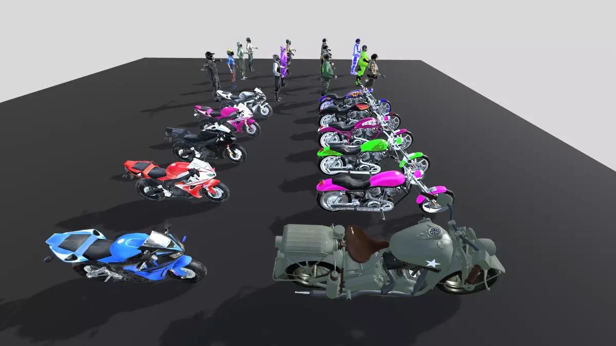 Overall, this image presents a professional set of game-ready 3D models with a high level of detail, versatility in application, and readiness for further animation or rendering processes. Whether you're building an immersive biker gang narrative, a fast-paced racing game, or a complex simulation environment, these assets provide a strong foundation for high-quality 3D content.