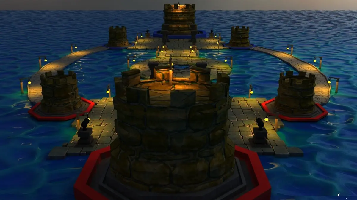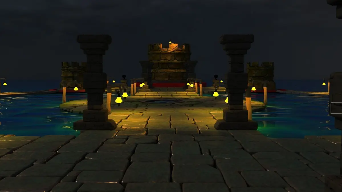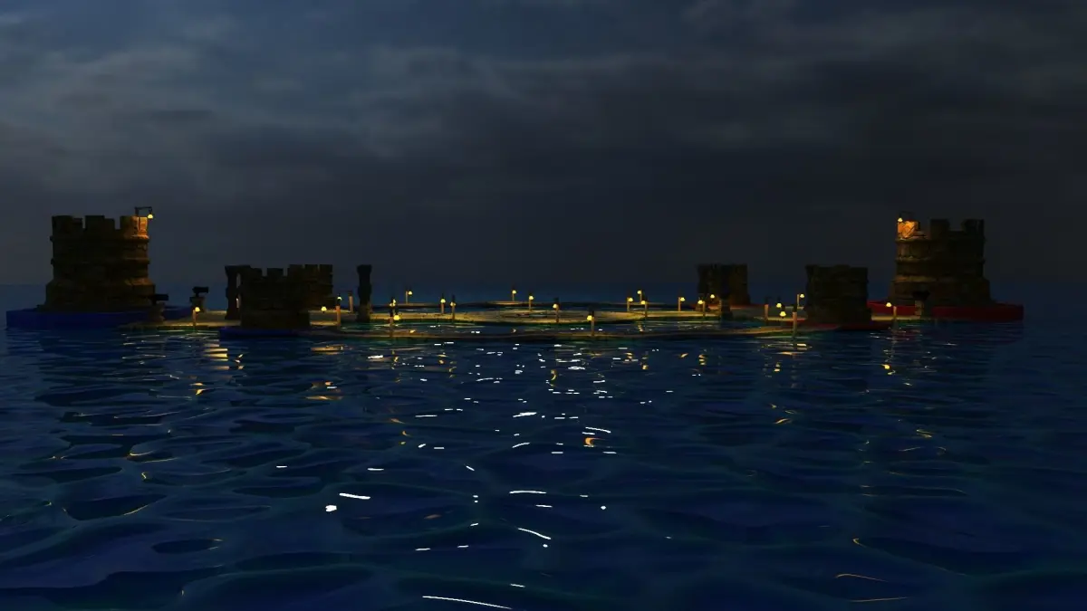 A 1v1 Battle arena of a floating castel design. High end 3d detailed texture with the lighting setup added to it.