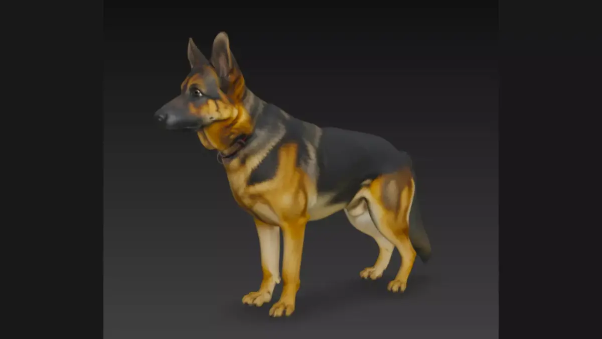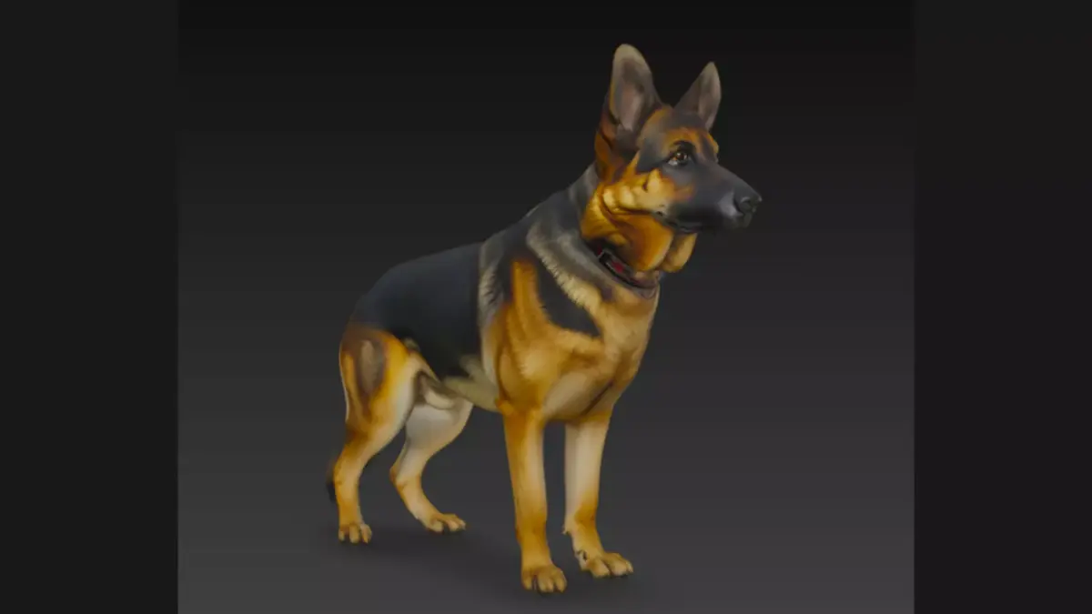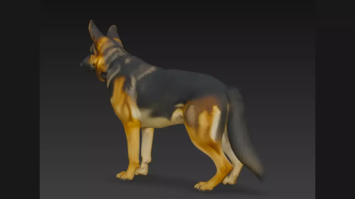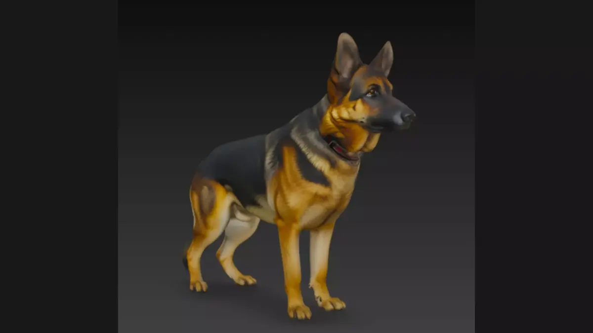 A high-quality 3D model of a German Shepherd dog, ideal for animations, video games, simulations, or architectural visualizations. Includes precise musculature, realistic fur textures, collar detail, and an alert standing pose.