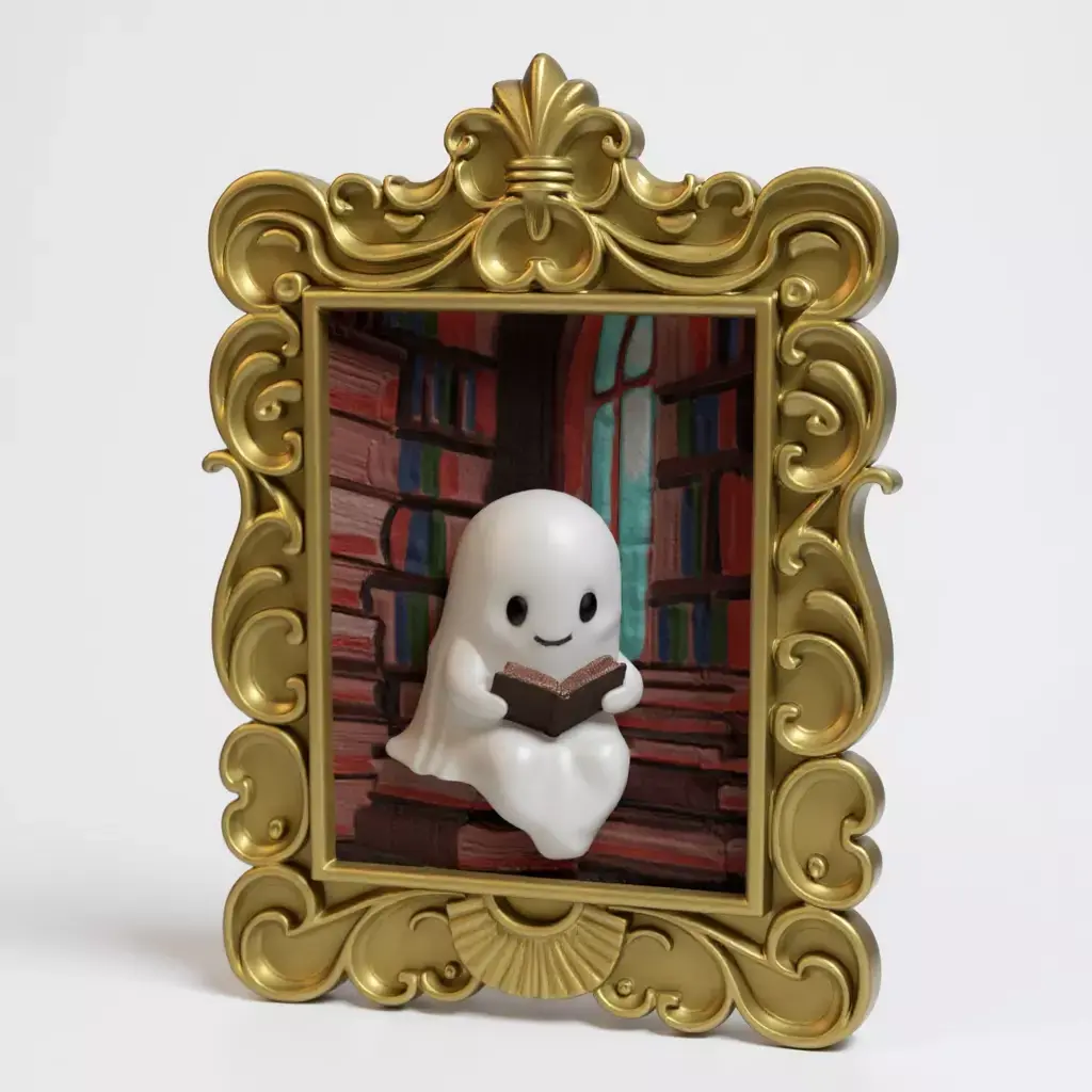 Product Description Charming Scene: A friendly ghost, with classic, flowing shapes, gently floating while holding and reading an open book. Immersive 3D Effect: Designed to create a sense of depth, as if the ghost is emerging from the frame or floating inside it, inviting the viewer to peek at its reading. Delicate Details: The book can feature small details on its pages and cover, and the ghost has a serene and curious expression. Decorative Versatility: Ideal for bedrooms, offices, libraries, or any corner that needs a touch of magic and tranquility. Optimized for 3D Printing: File prepared to be easily printed, allowing you to customize the colors and finish of both the frame and the ghost.