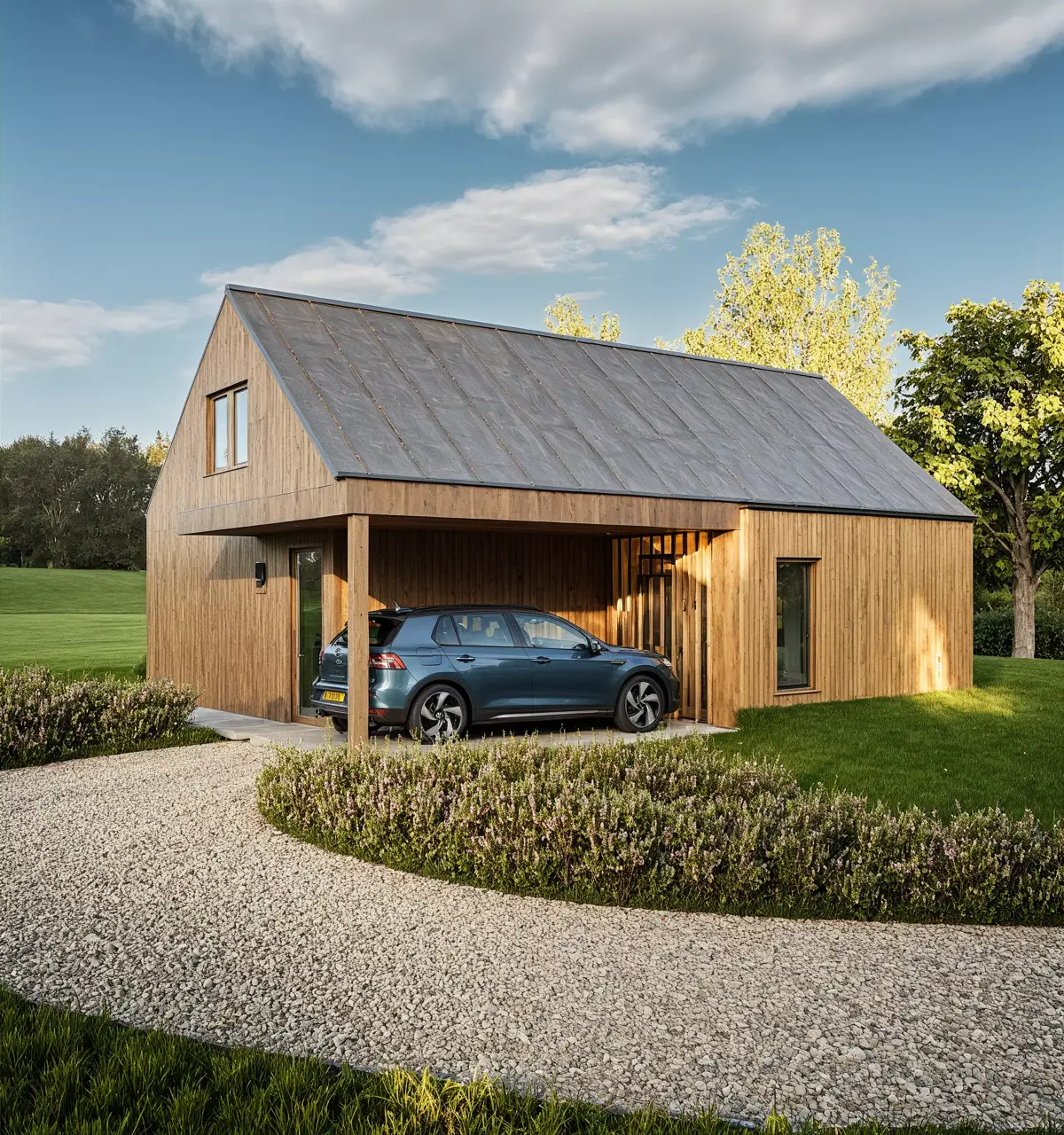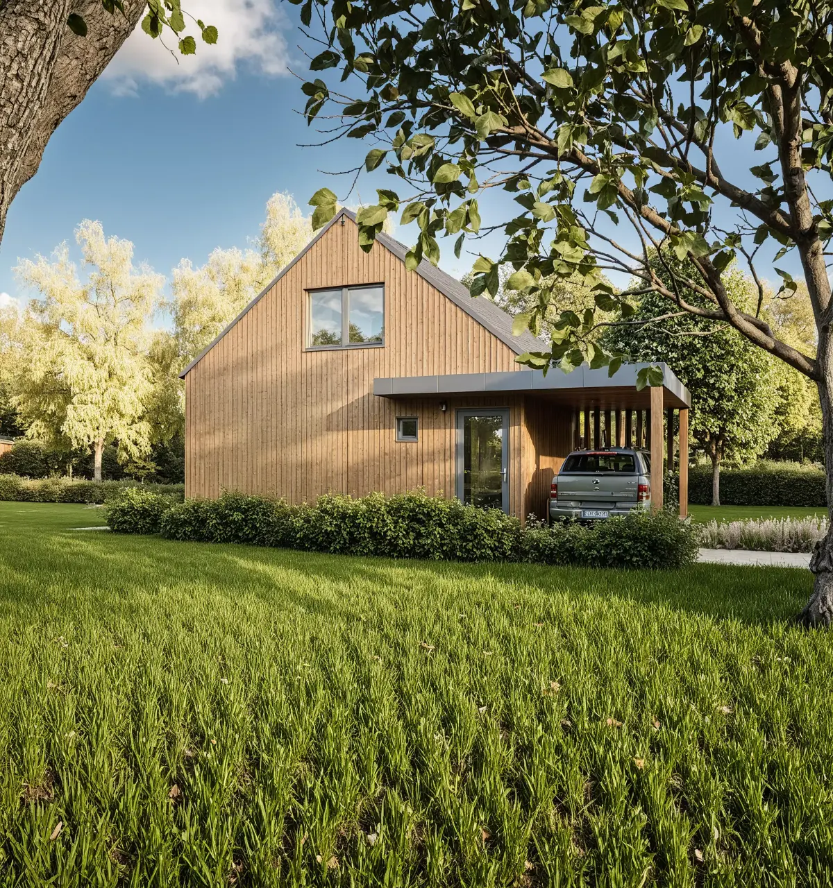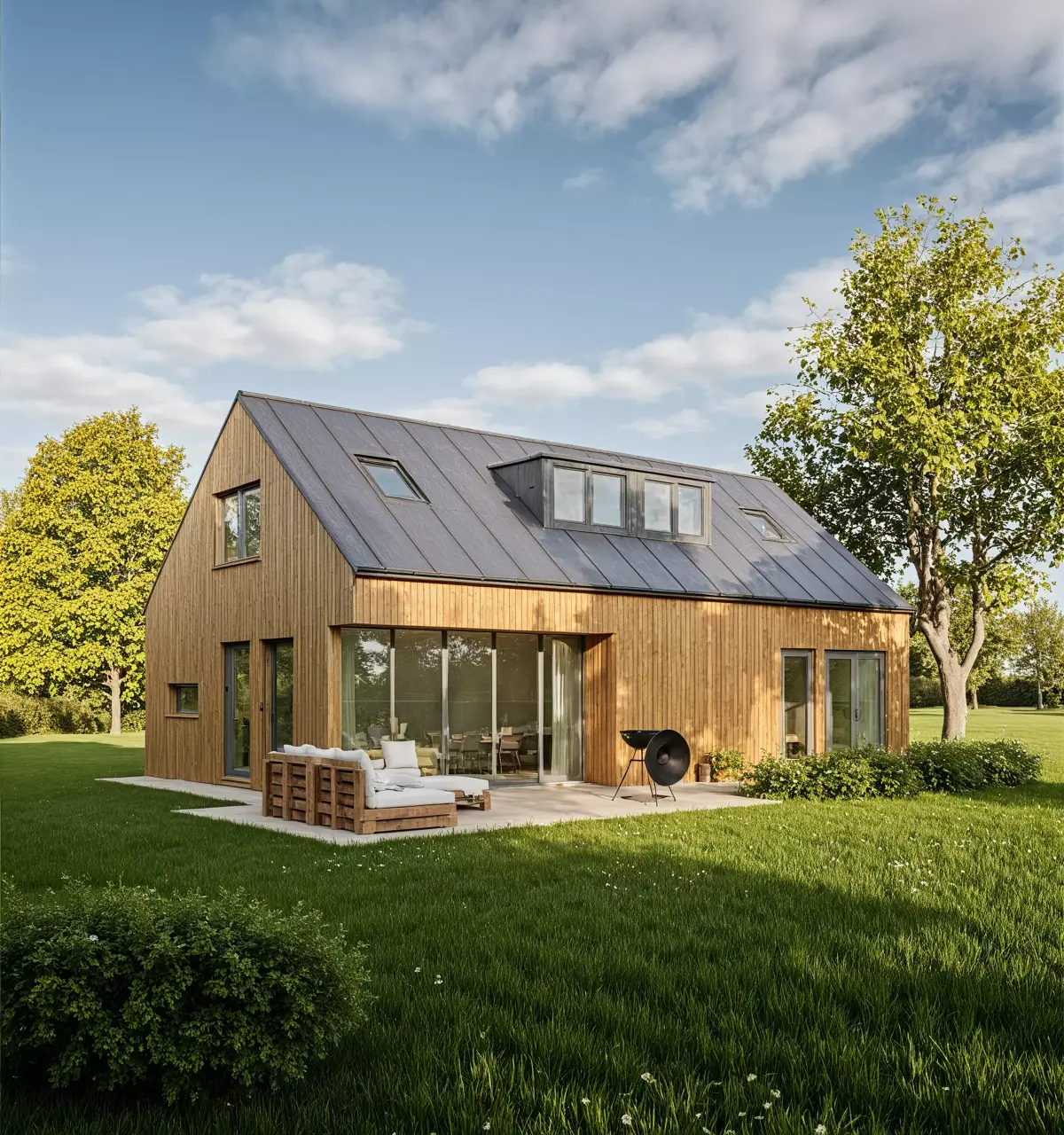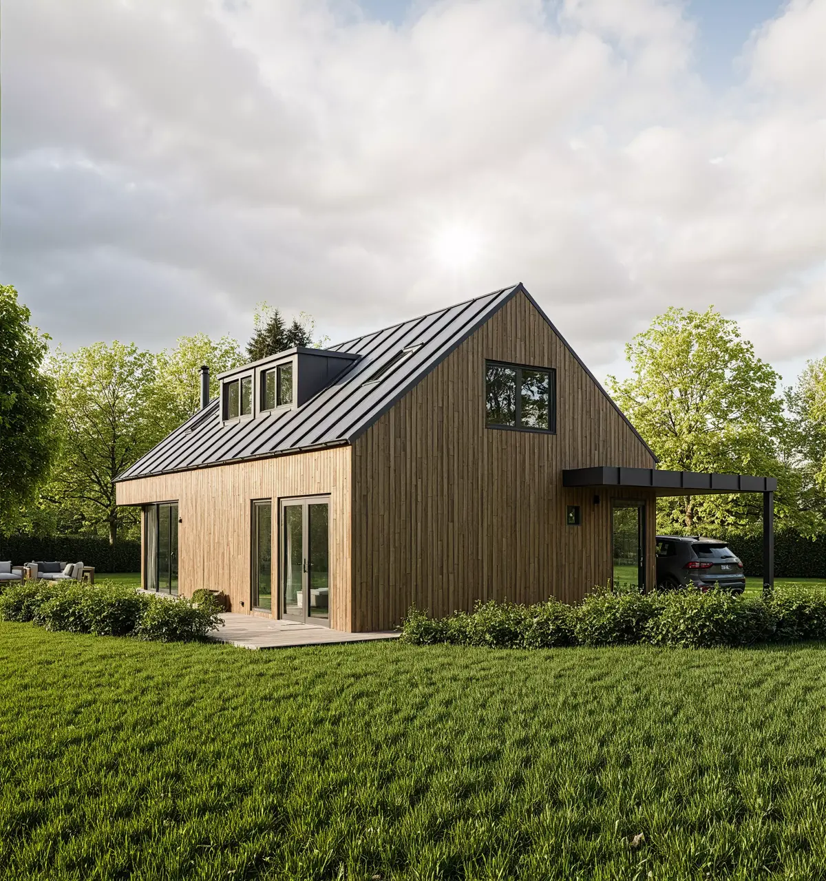 The house combines a natural wooden façade with a dark metal roof and large glass doors, giving it a clean, modern look suitable for residential or eco-living concepts.
