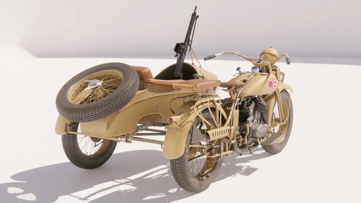 The model includes all its subdivision levels available, from 0 to 3, and features regular controls to easy manipulate wheels, steering, gun, sidecar door and front light cover. Simply click on a control, and rotate it to move these parts.Shape keys have been created to allow the wires deform nicely along with the steering.