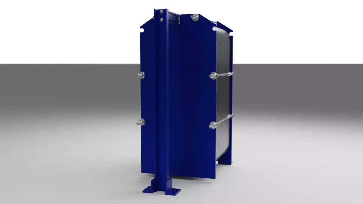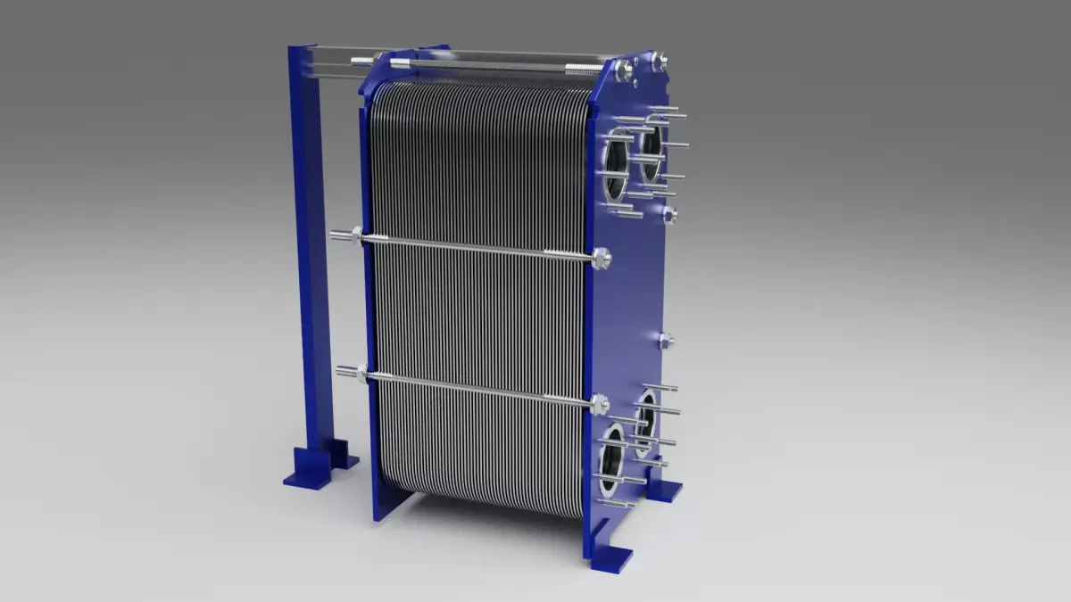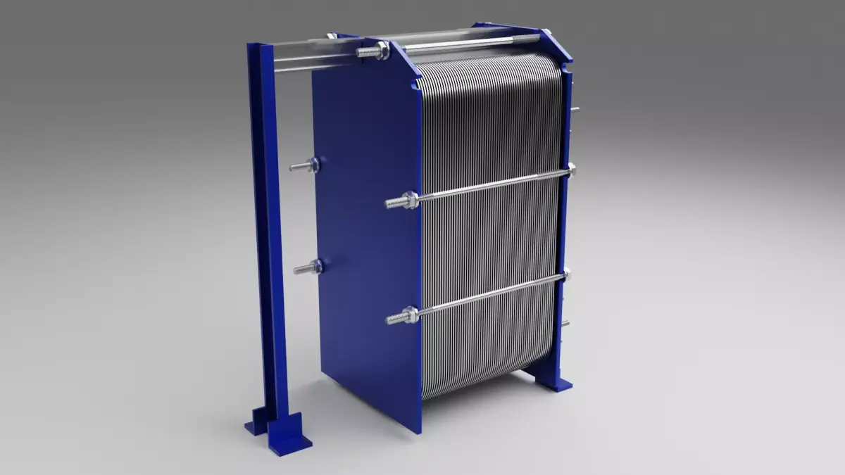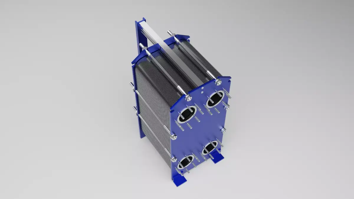 Plate heat exchanger used in chilled and heating water systems.This model represents a heat exchanger commonly found in cooling and thermal energy distribution systems.It is not built to real-world engineering scale and is intended for simple visual representation only.